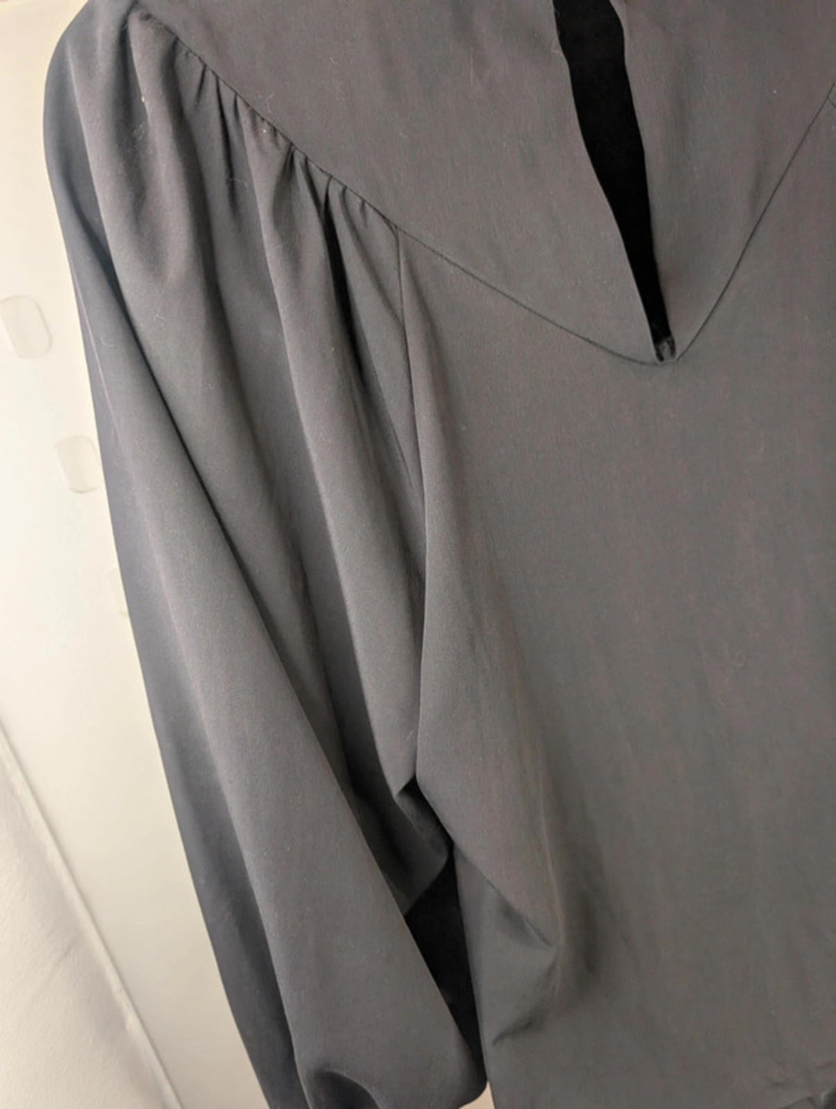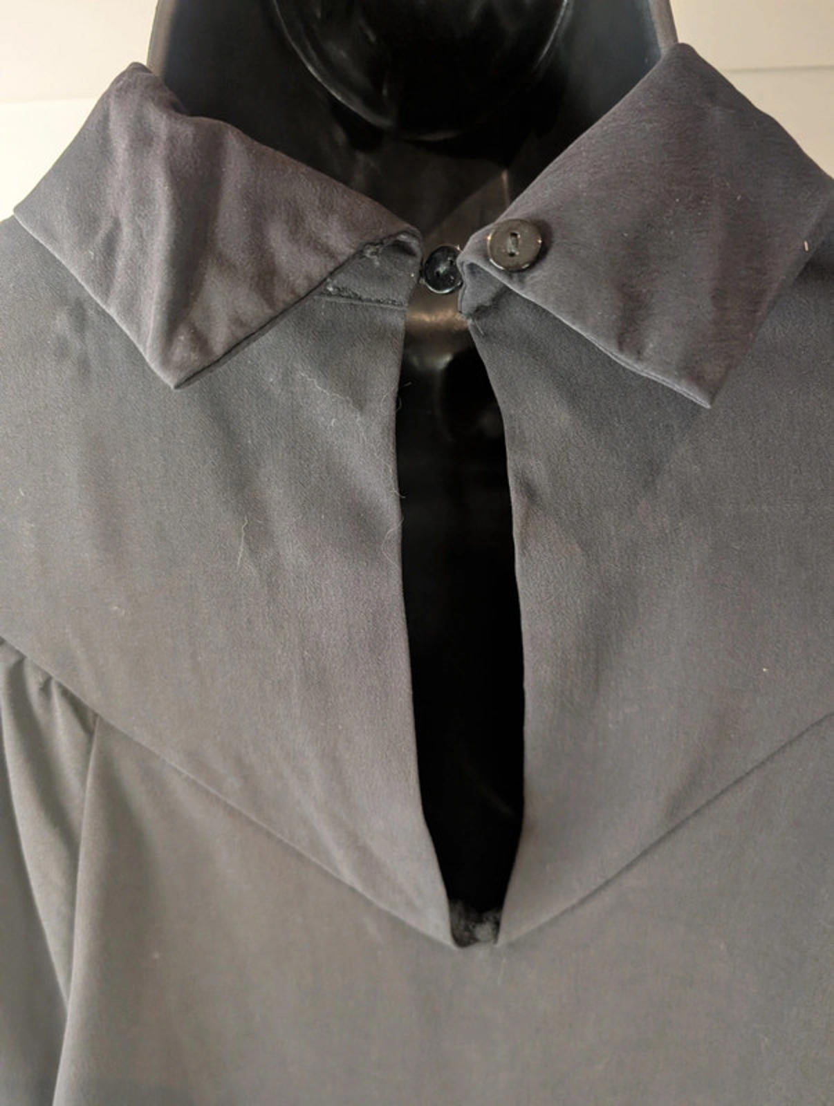 Elegant black blouse in a soft, fluid fabric with a dramatic gothic-inspired silhouette. Features a high neckline, gathered front panel, and statement balloon sleeves with shirred cuffs.
