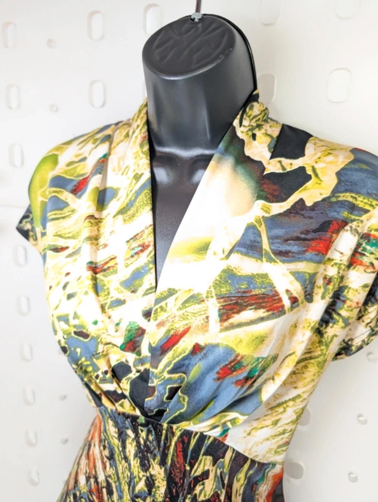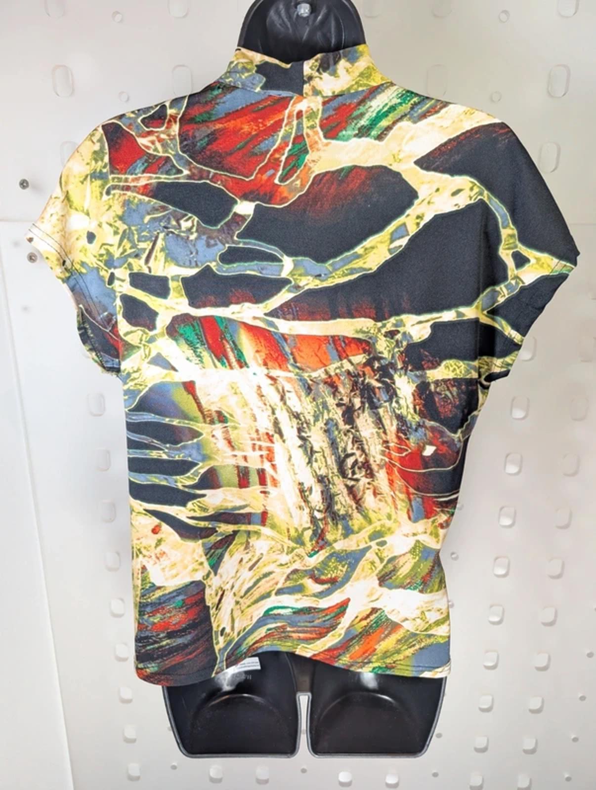 Bassini printed stretch top, size small. Soft, fluid fabric that drapes beautifully, falling almost like a kimono when worn.