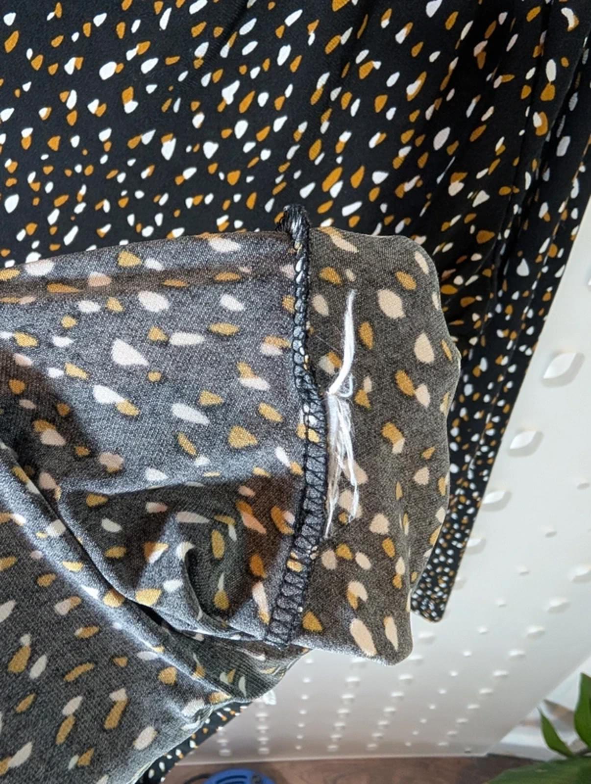 DKNY tan, black and white speckled print top, size medium. Elegant high neckline with statement button detail at the shoulder.