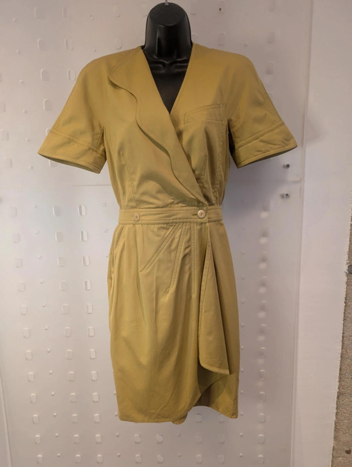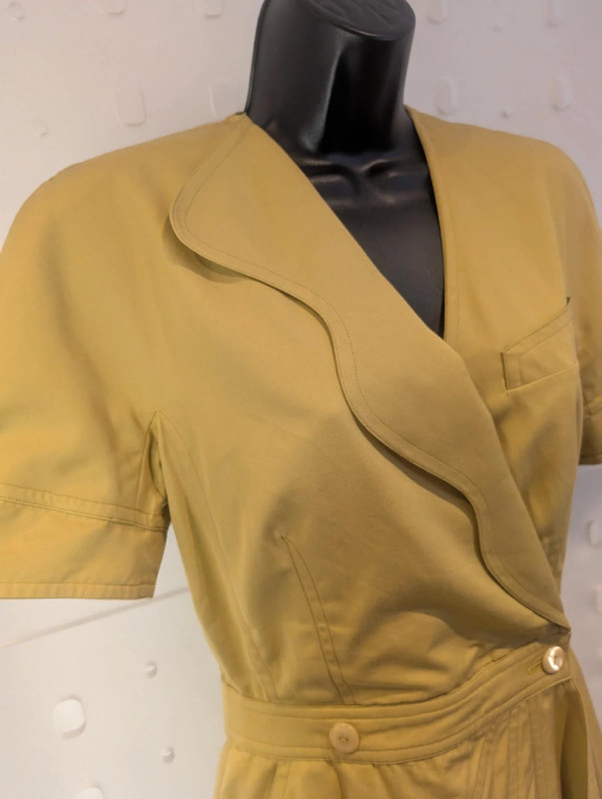 Beautiful vintage faux wrap dress by luxury label Escada in a chic ochre/mustard yellow. Features short sleeves, V-neckline, buttoned waist detail and a softly draped skirt with concealed zip. Flattering, elegant, and versatile for both day and evening wear.