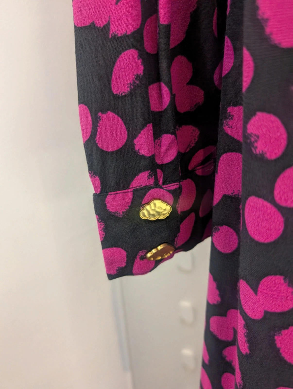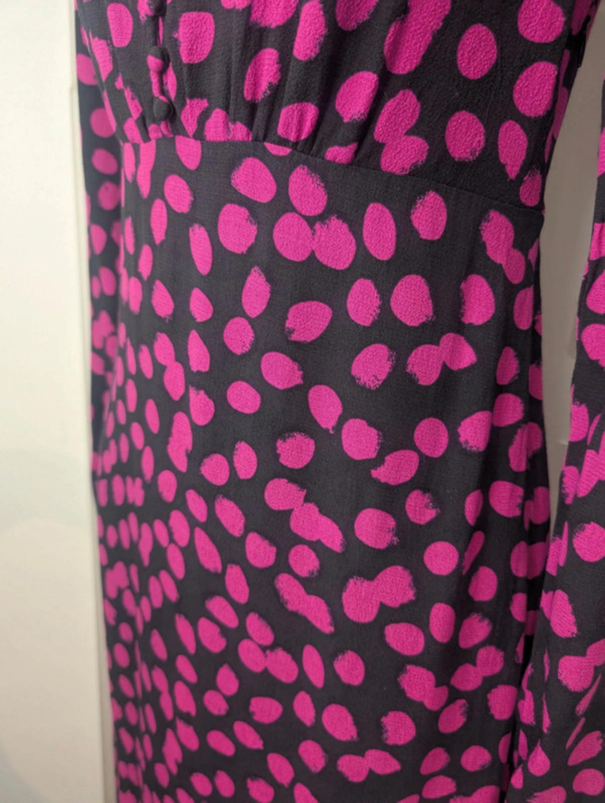 Beautiful quality designer piece by Fabienne Chapot, known for bold prints and feminine silhouettes. The Lewis dress features a striking fuchsia and black abstract spot pattern, deep V neckline and subtle puff shoulders for a flattering shape. Maxi length with side slits for movement and a concealed side zip fastening.