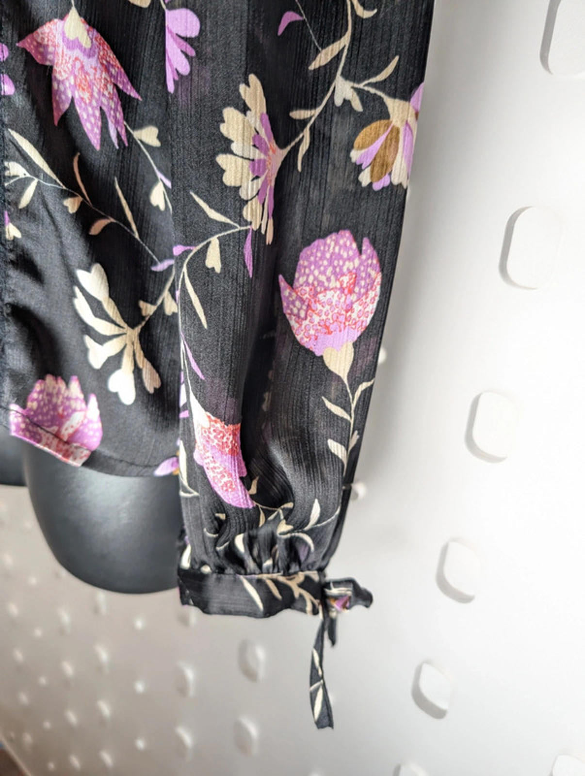 The ultimate romantic coquette vibe. This "Pomme" top is crafted from airy, sheer black chiffon with the dreamiest pink and lilac floral print. Featuring a high ruffled neck and delicate lace inserts, it’s that perfect mix of Victorian-inspired and modern chic.