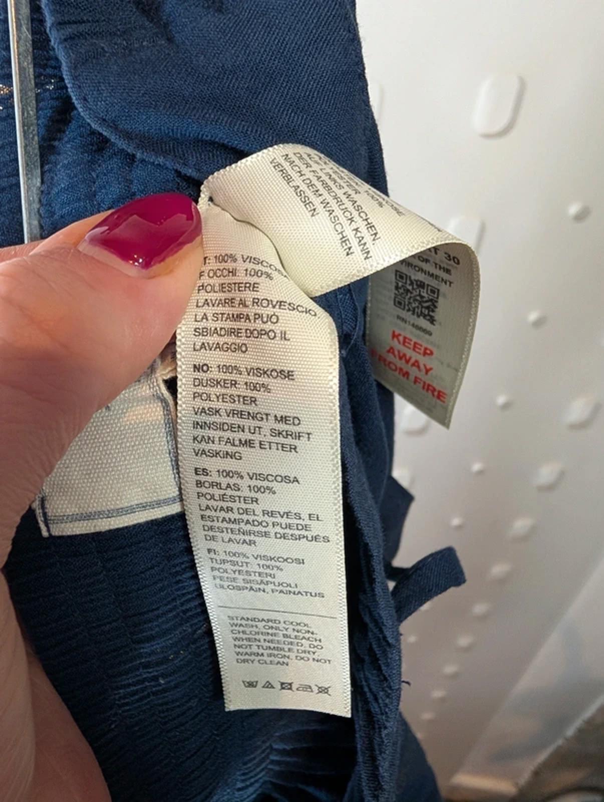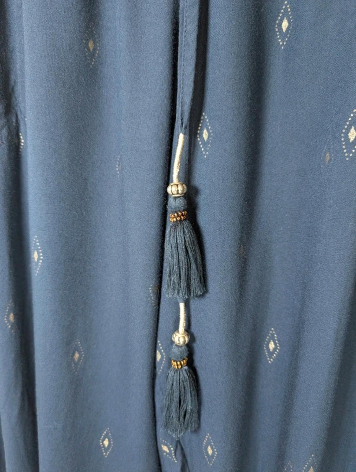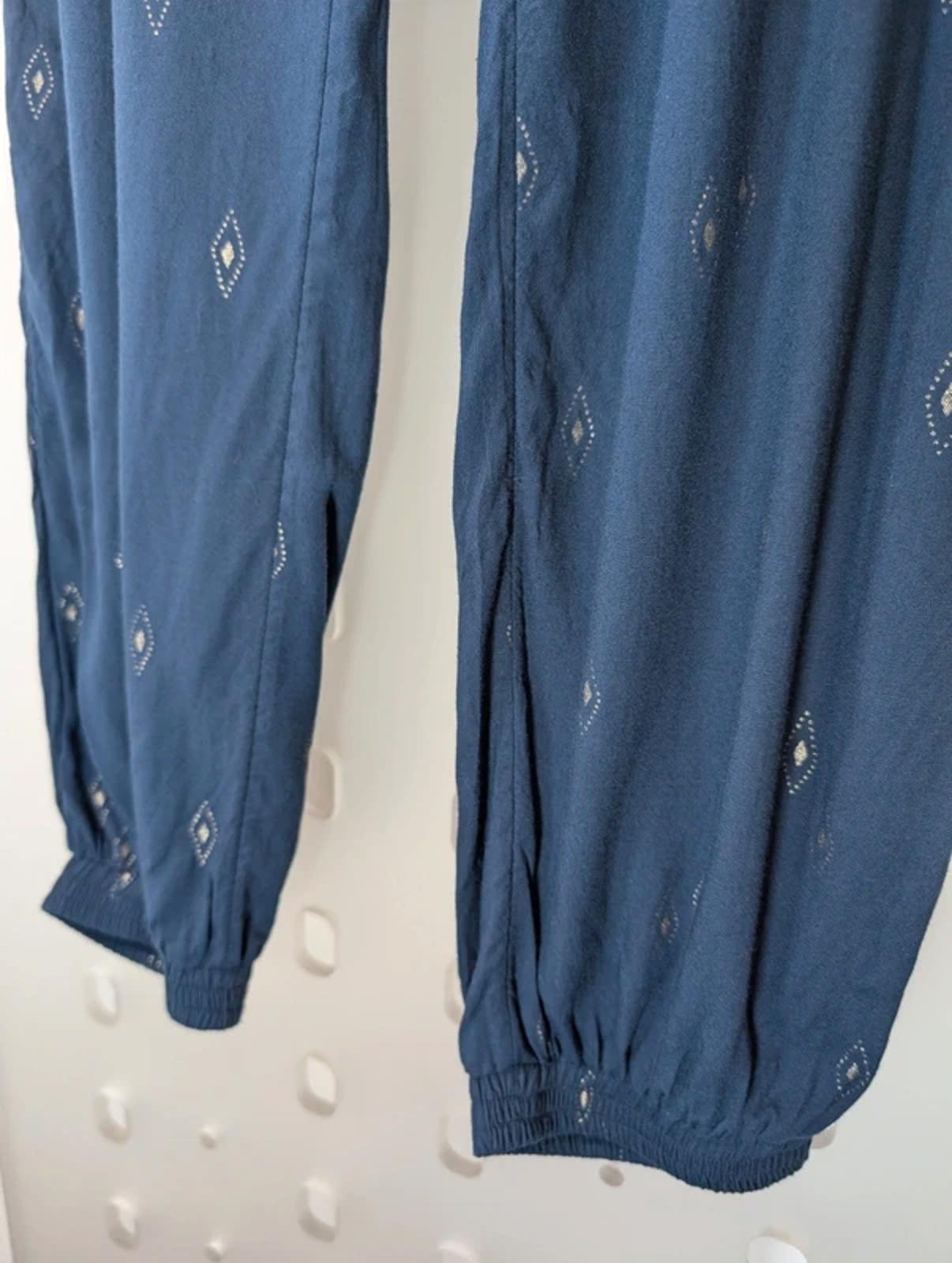 Relaxed navy viscose trousers by Fat Face with a subtle silver print throughout. Comfortable elasticated waistband with tie detail and decorative tassels. Side pockets and back pockets for practicality, with elasticated cuffs for an easy tapered shape.