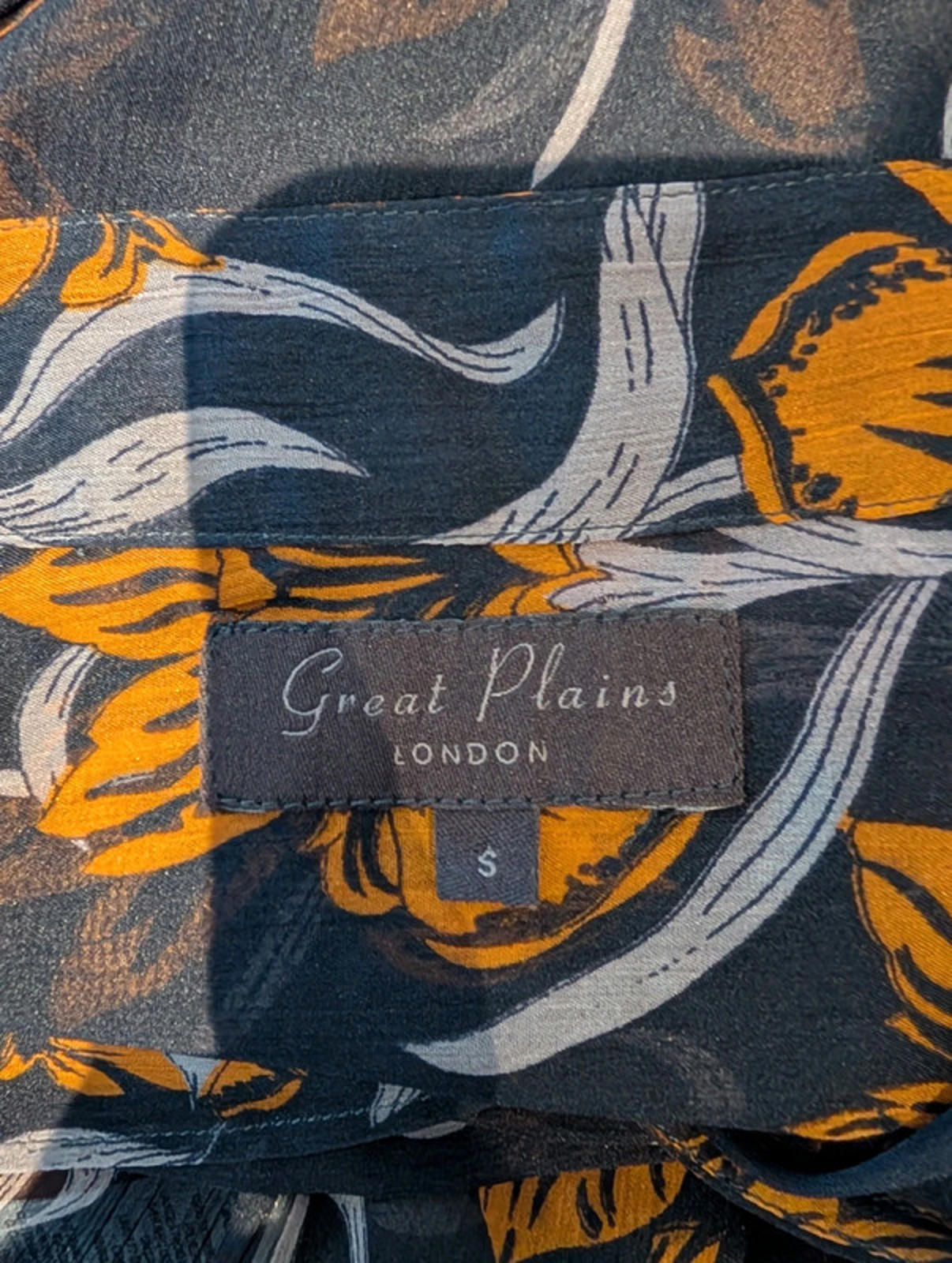Beautiful sheer navy blouse by boutique brand Great Plains, size small. Features a delicate William Morris–style floral print with an elegant asymmetrical frill running down the front, giving it a soft, feminine and romantic feel.