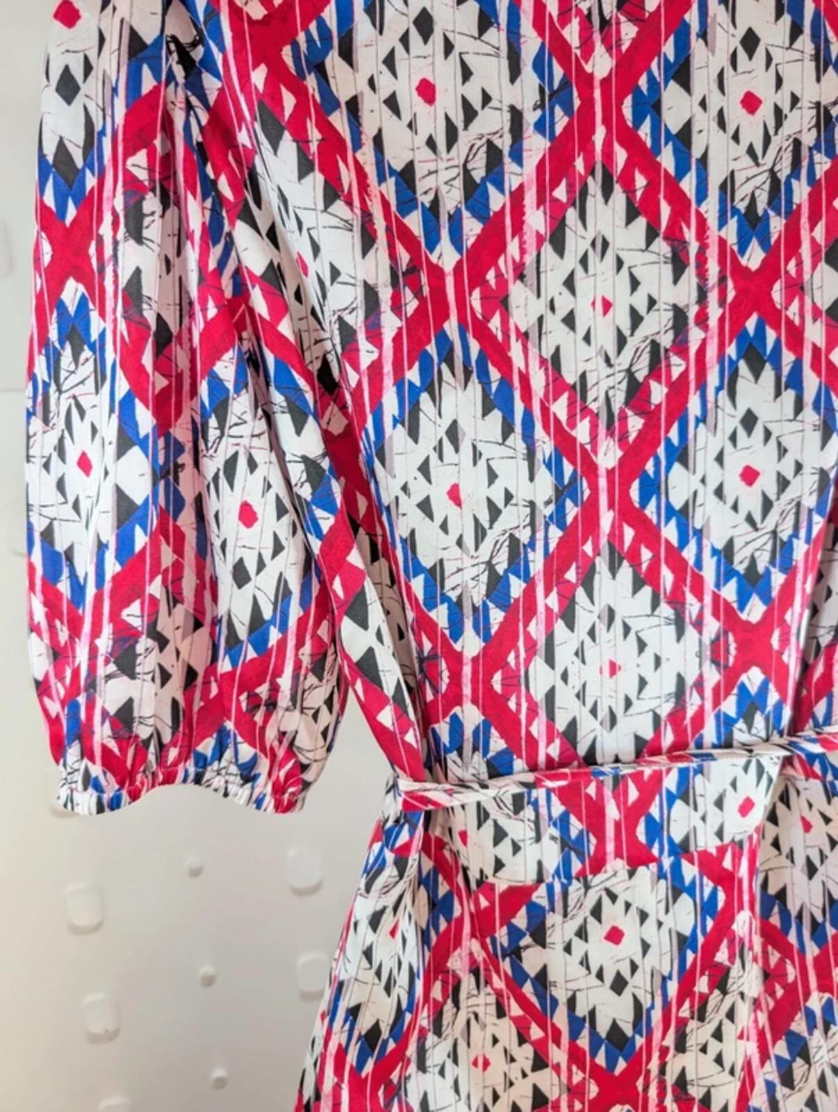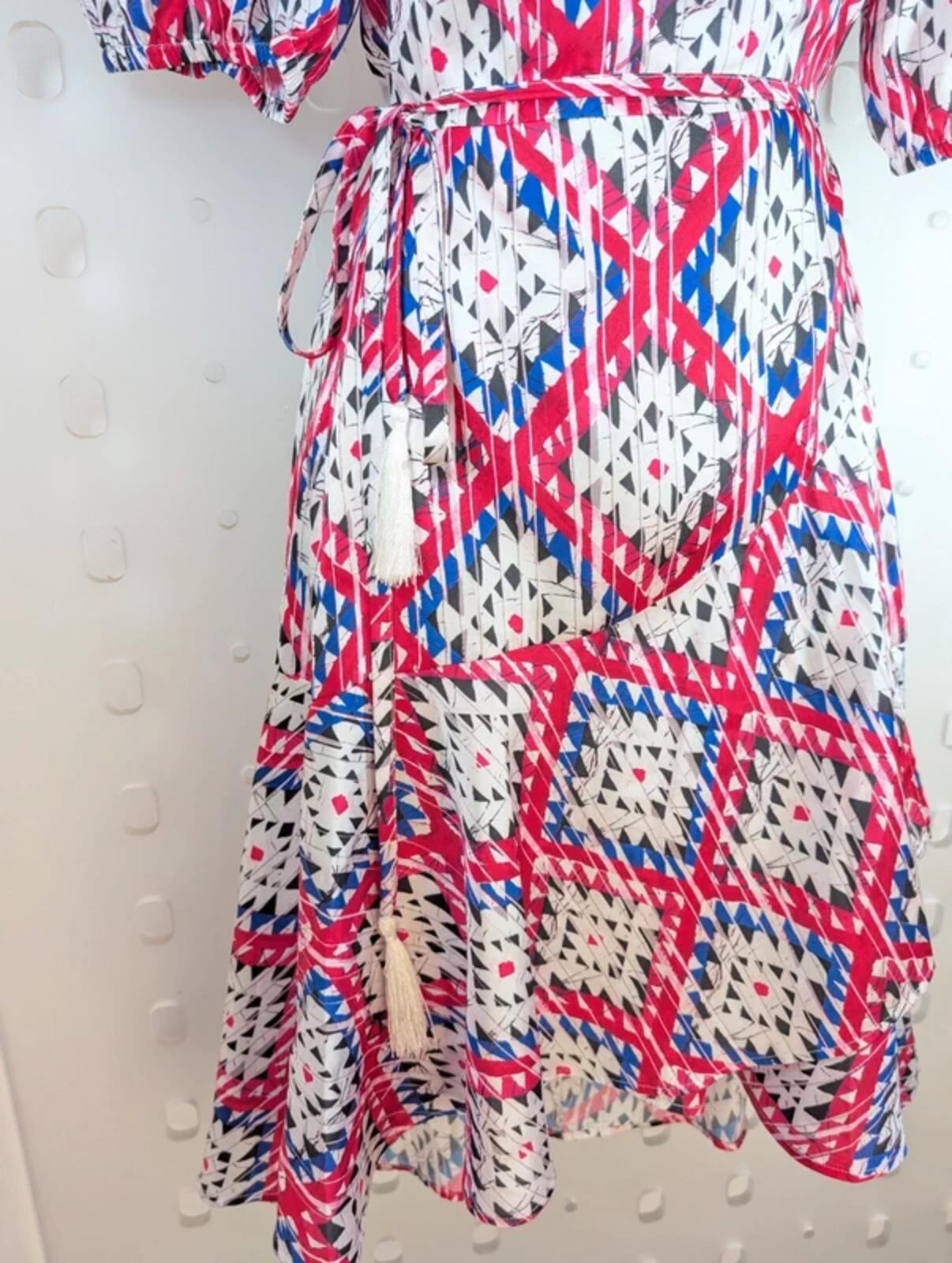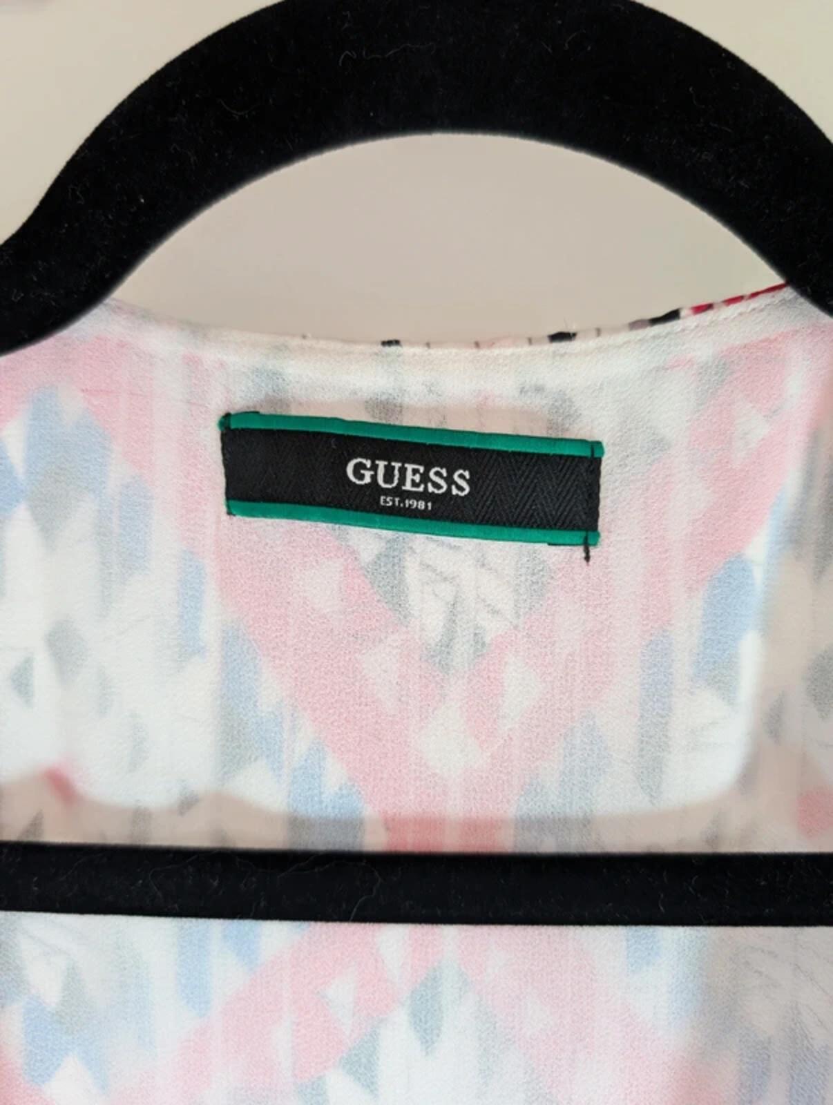 Guess Satin Wrap Dress – Puff Sleeve Tie Waist – Printed Midi – S