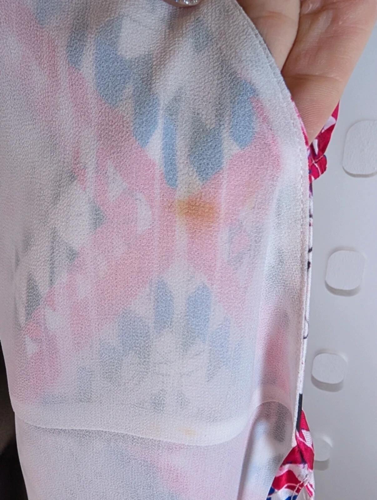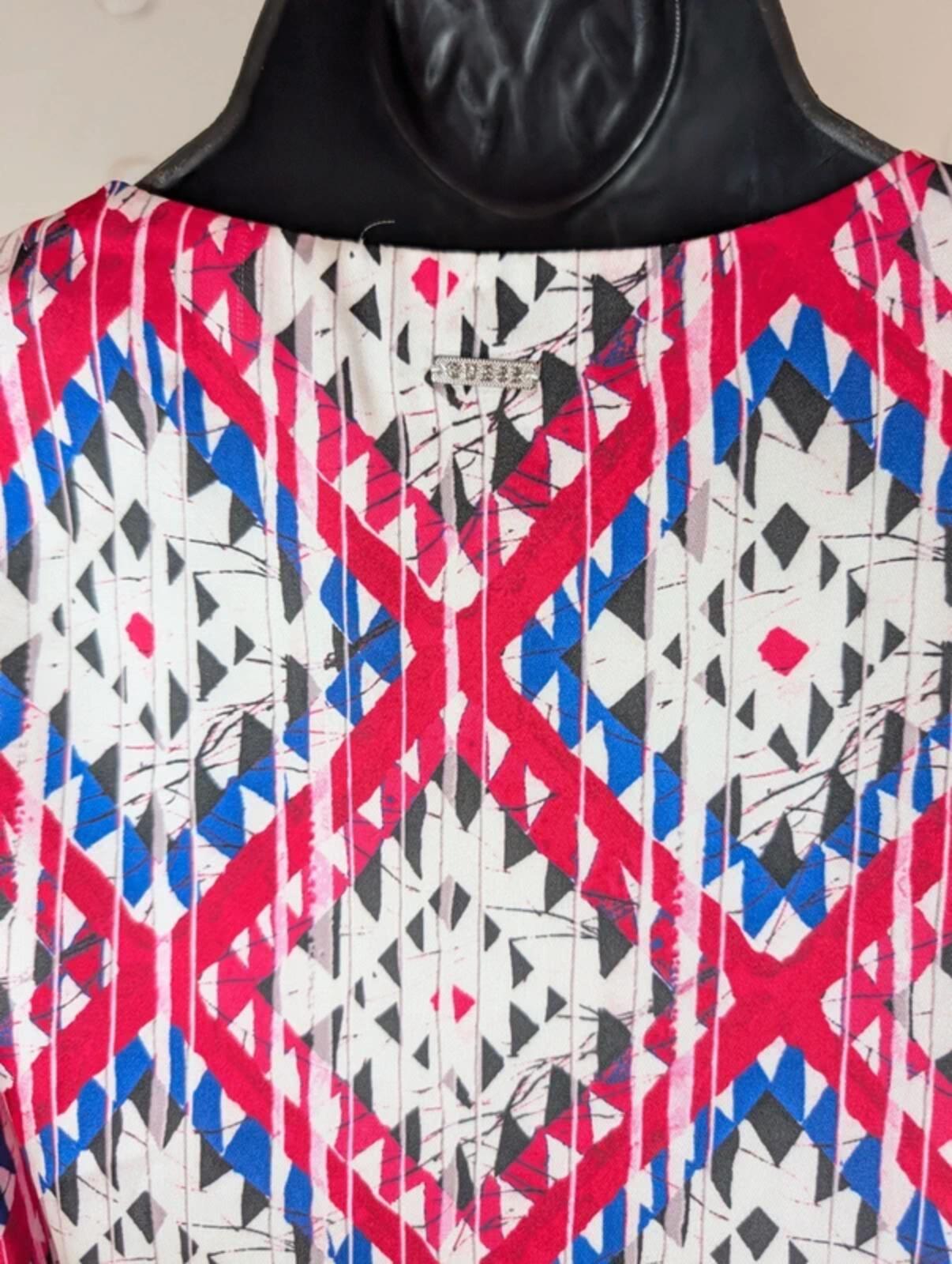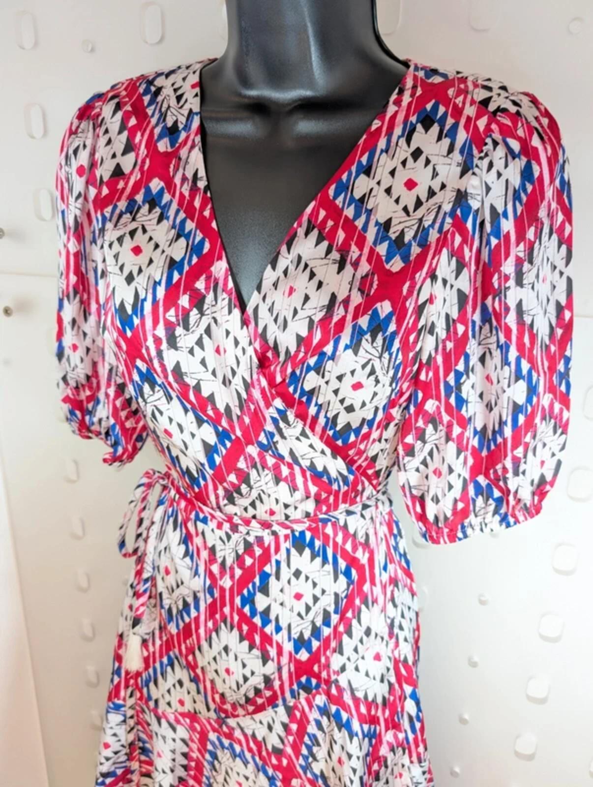 Really pretty Guess wrap dress in a bold blue, white, black and fuchsia print. Soft satin feel with a flattering wrap front, elasticated puff sleeves and a tie waist for shape. Lined through the body for comfort with a floaty, feminine finish – perfect for day to evening wear.