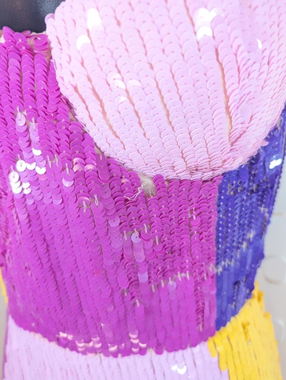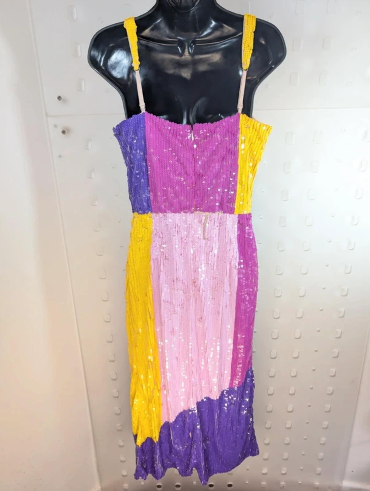 Statement sequin midaxi dress by Lace & Beads in a bold colour block design. Structured bodice with padded cups for shape and support, adjustable straps and centre back zip. Fully embellished with all-over sequins that catch the light beautifully – such a fun, standout piece for parties, holidays or festivals. Labelled UK14. P2P 18” with stretch, waist 28” with stretch, shoulder to hem 48”.