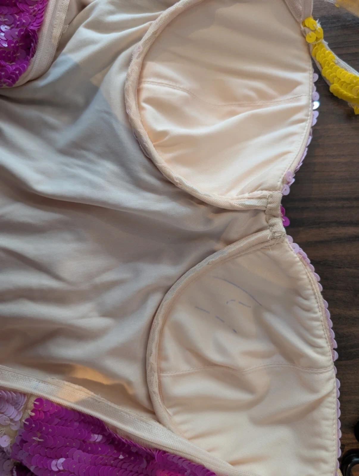 New with tags, replacement sequin packet still attached. A few sequins missing in places and small biro marks inside one cup (not visible when worn), reflected in price.