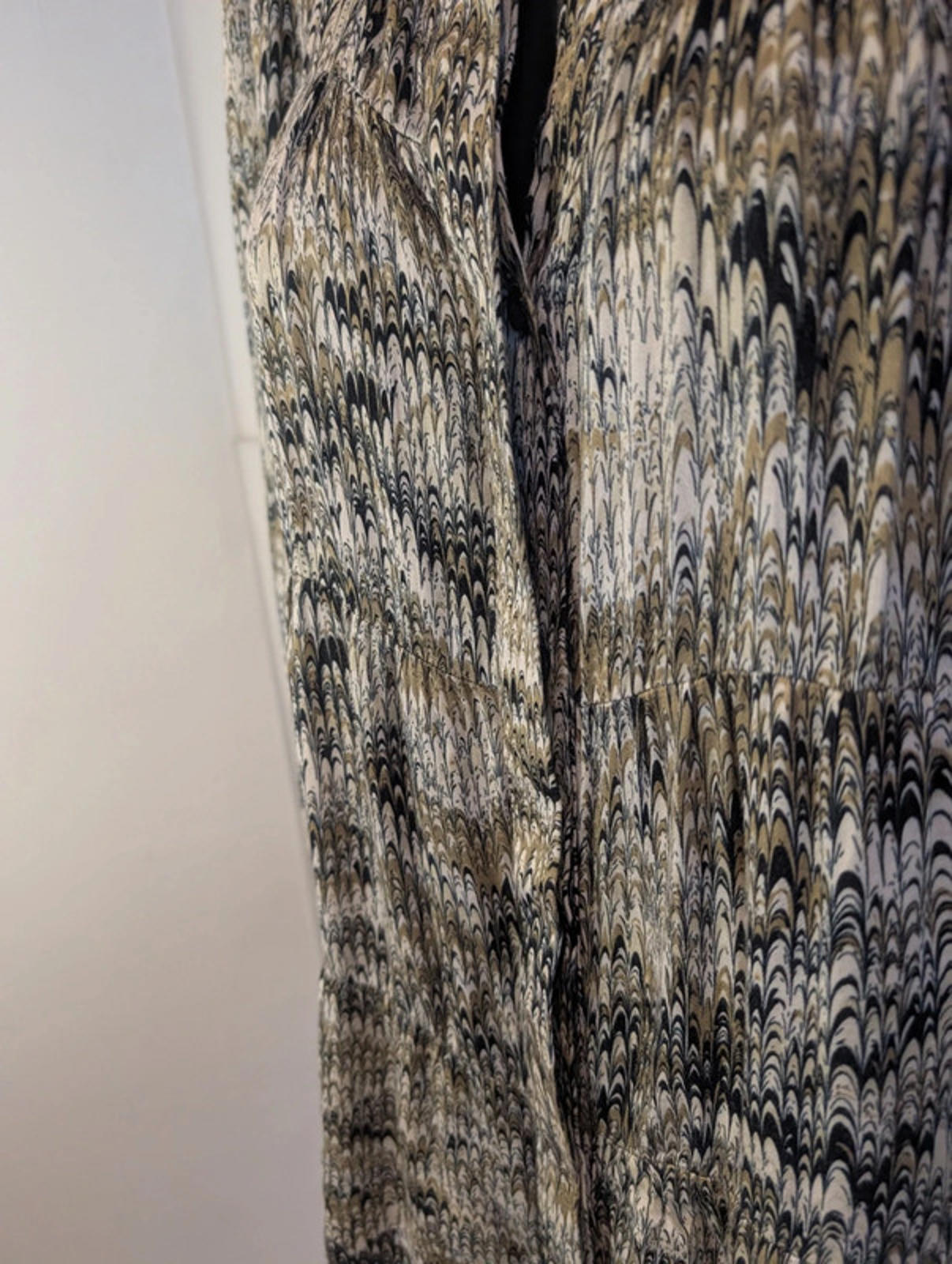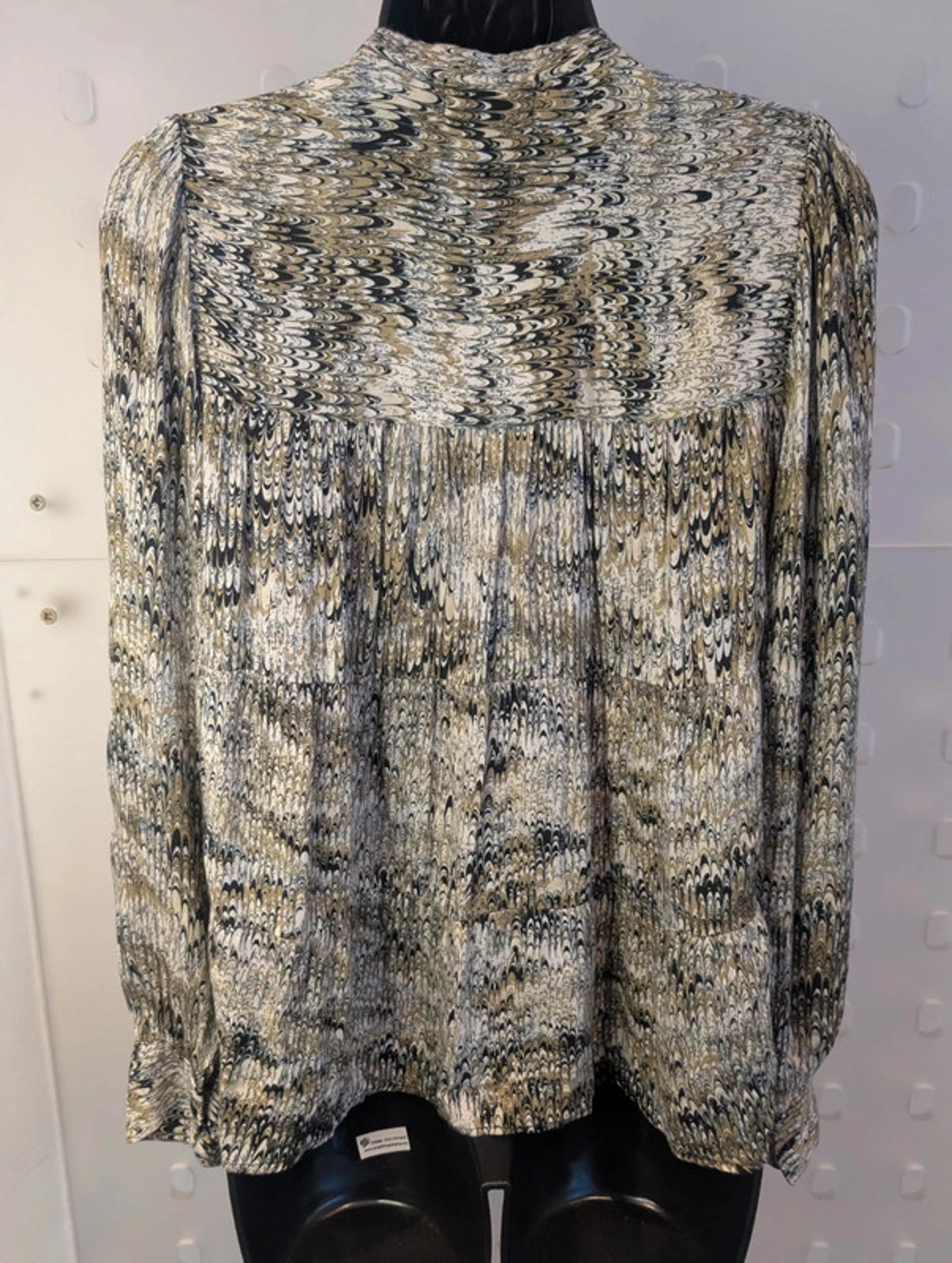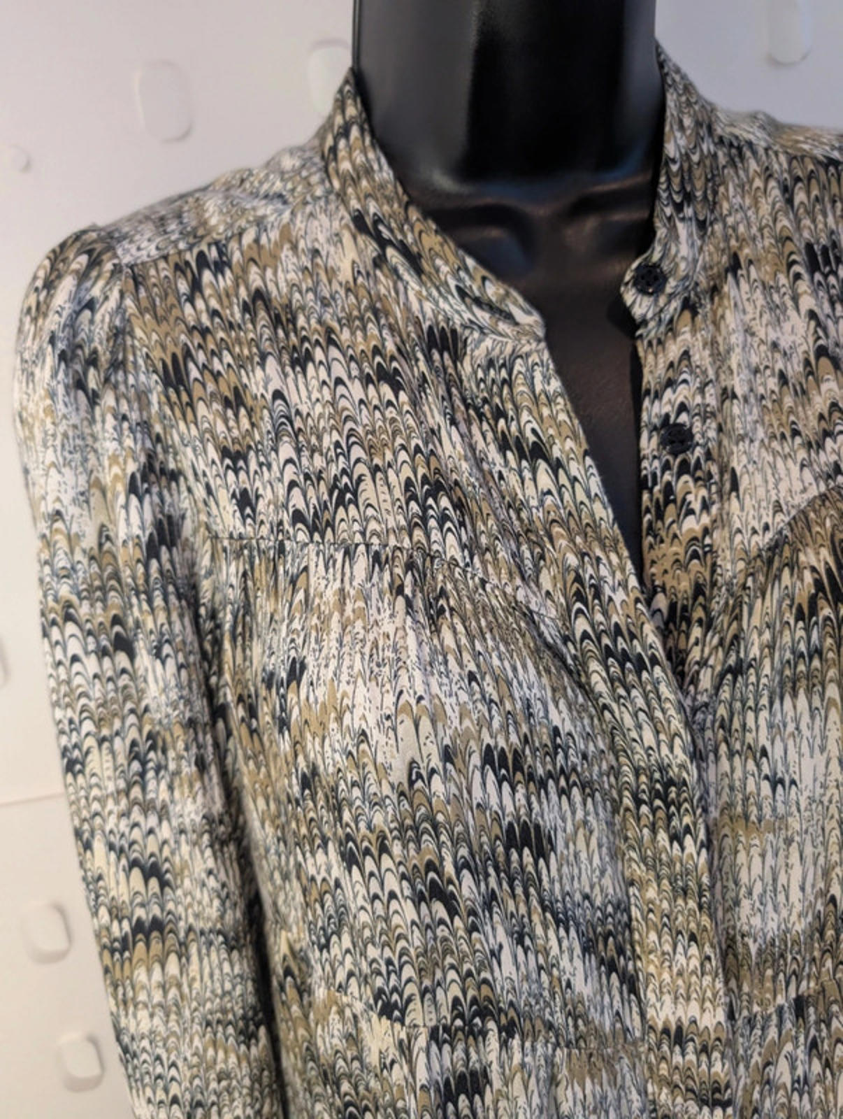 Chic blouse from Scandinavian label Levete Room. Crafted in lightweight viscose with a striking marbled feather print in tones of black, khaki and cream. Features a neat band collar, button-through fastening, long sleeves with button cuffs, and soft gathers at the back yoke for a relaxed drape.