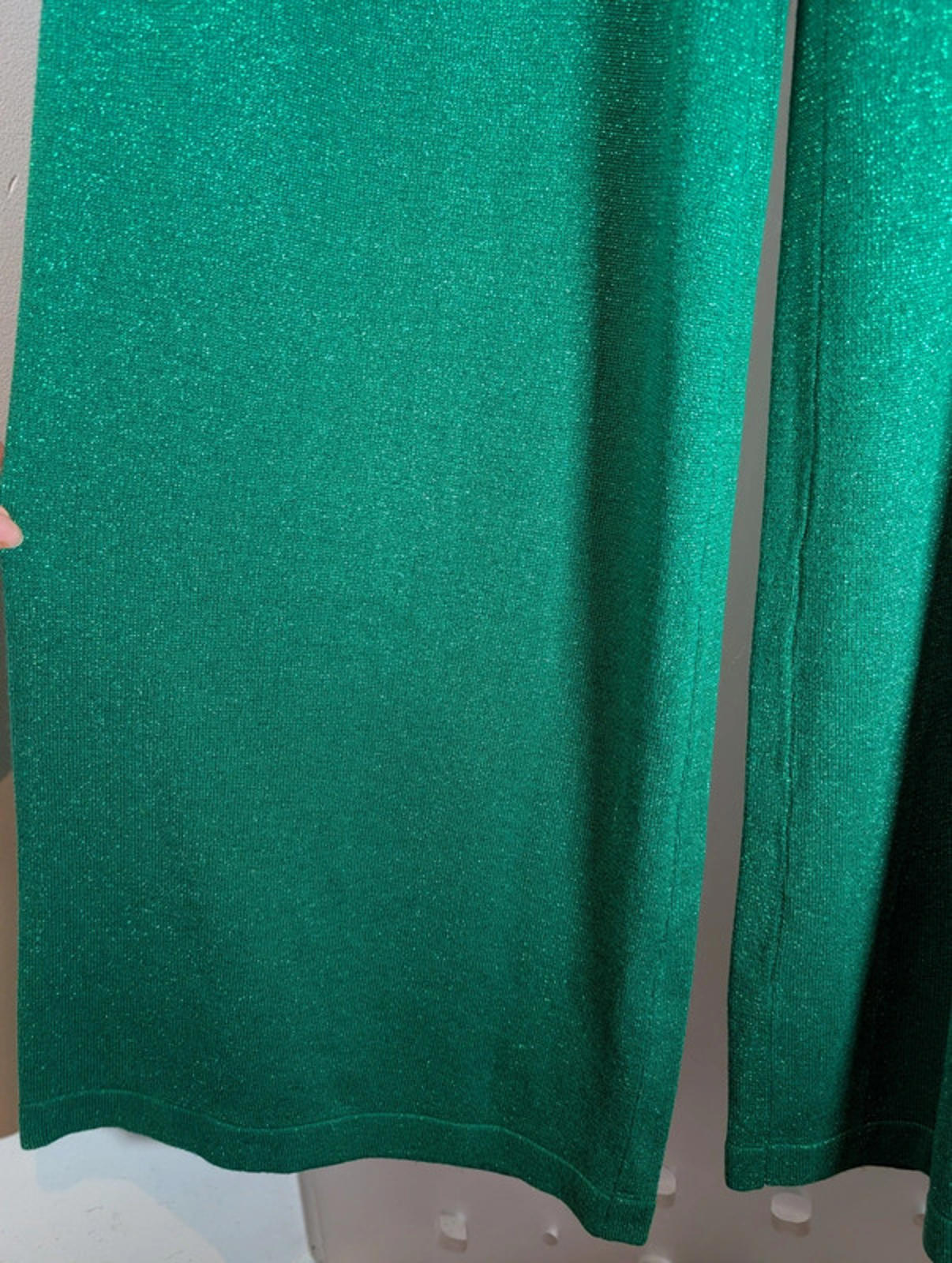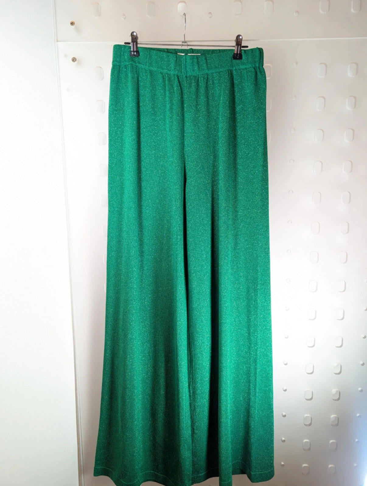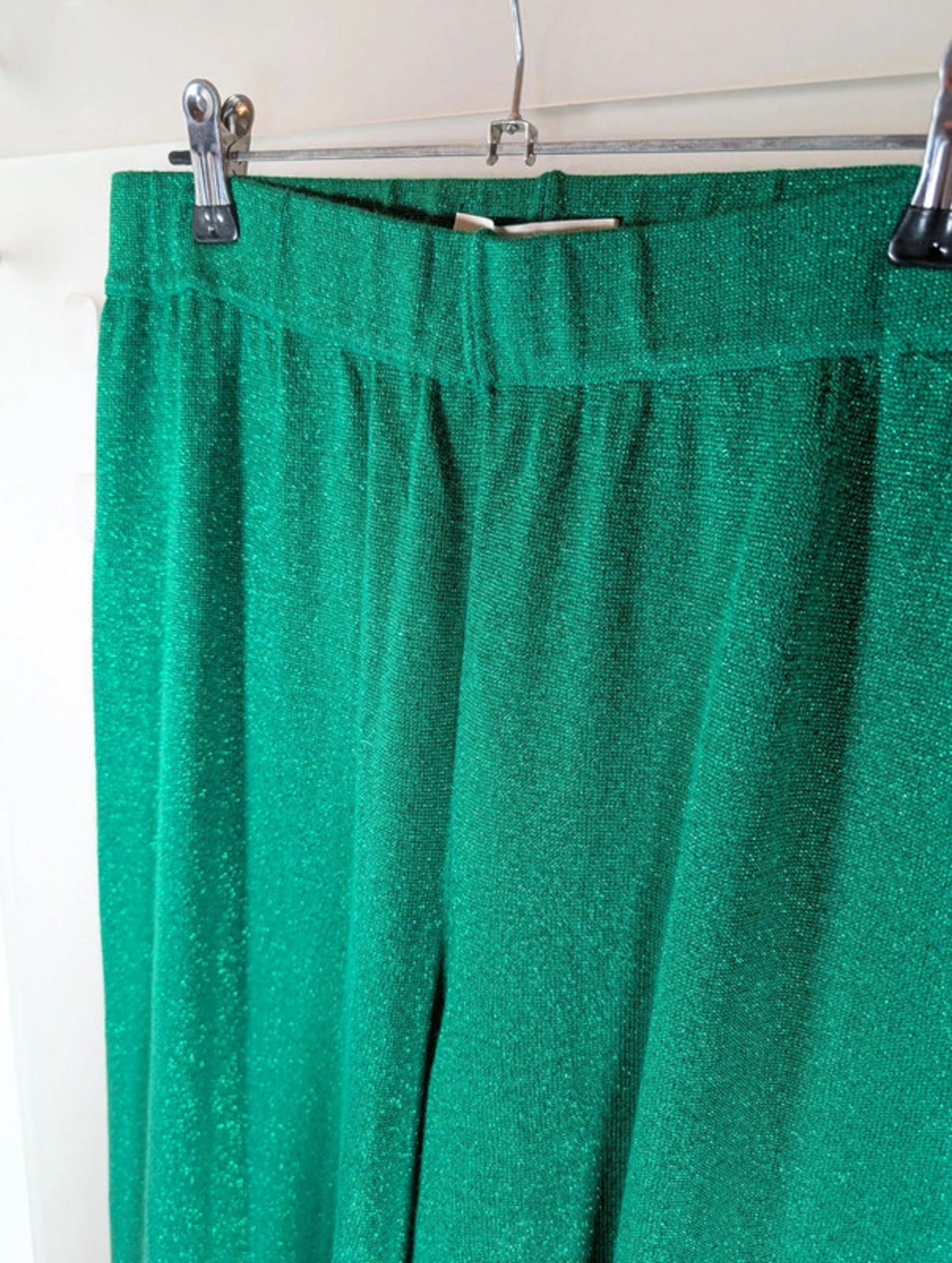 Brand new with tags. Stunning emerald green wide-leg trousers in a soft stretch fabric with a subtle shimmer. Comfortable elasticated waistband and beautiful drape. Matching top available in size Large if you want the full co-ord look.