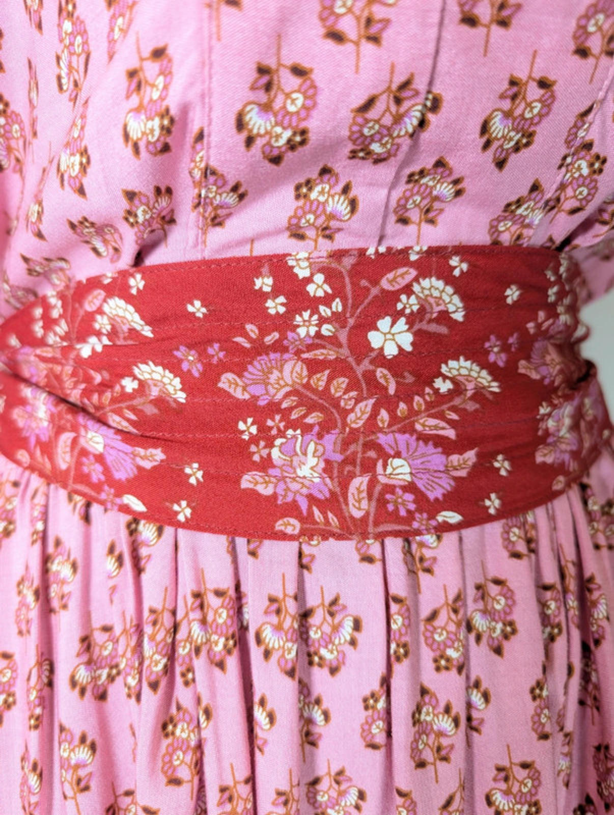 Size L. Soft, fluid viscose fabric with a striking red border print on the sleeves, skirt and waist tie.