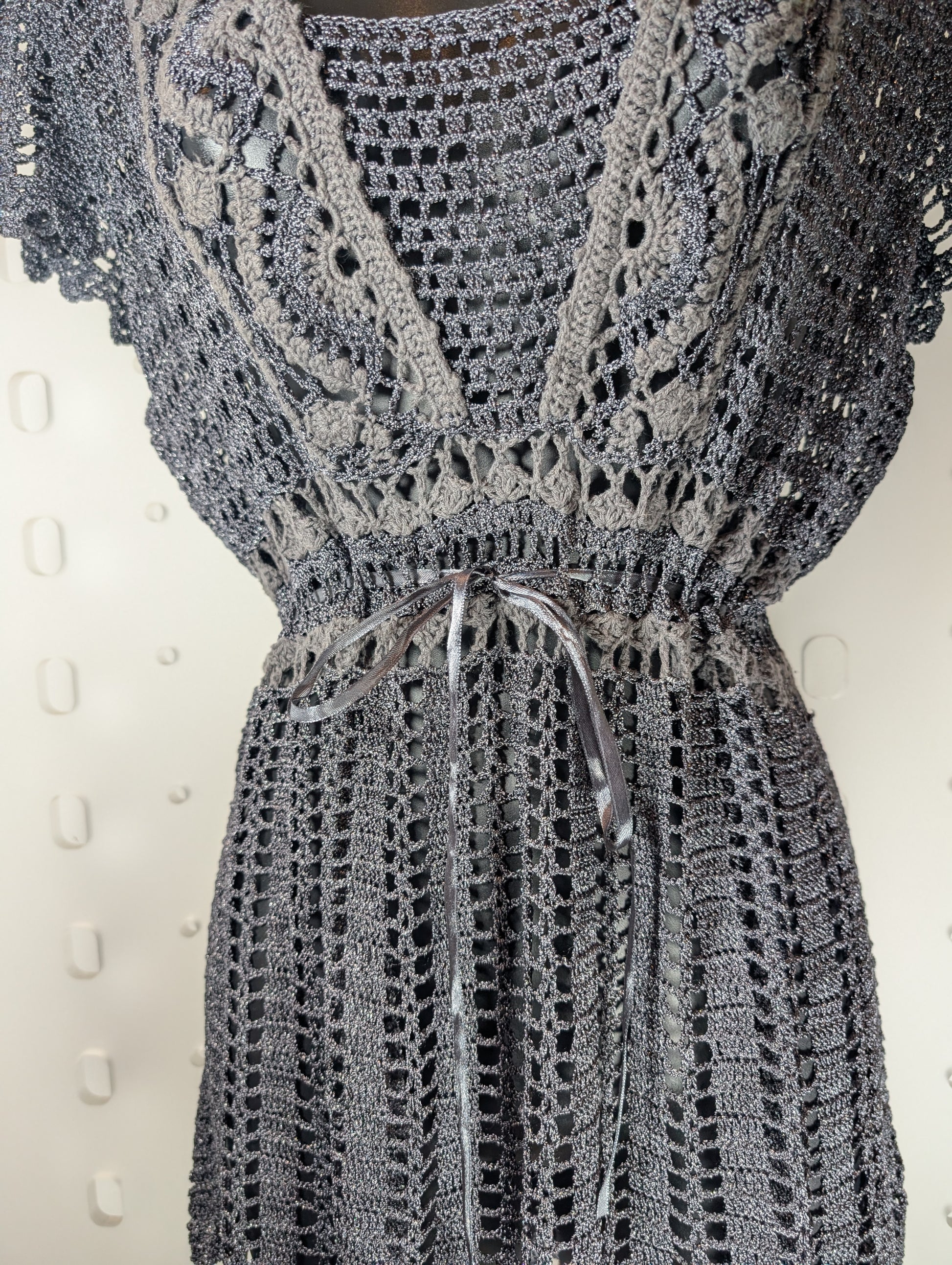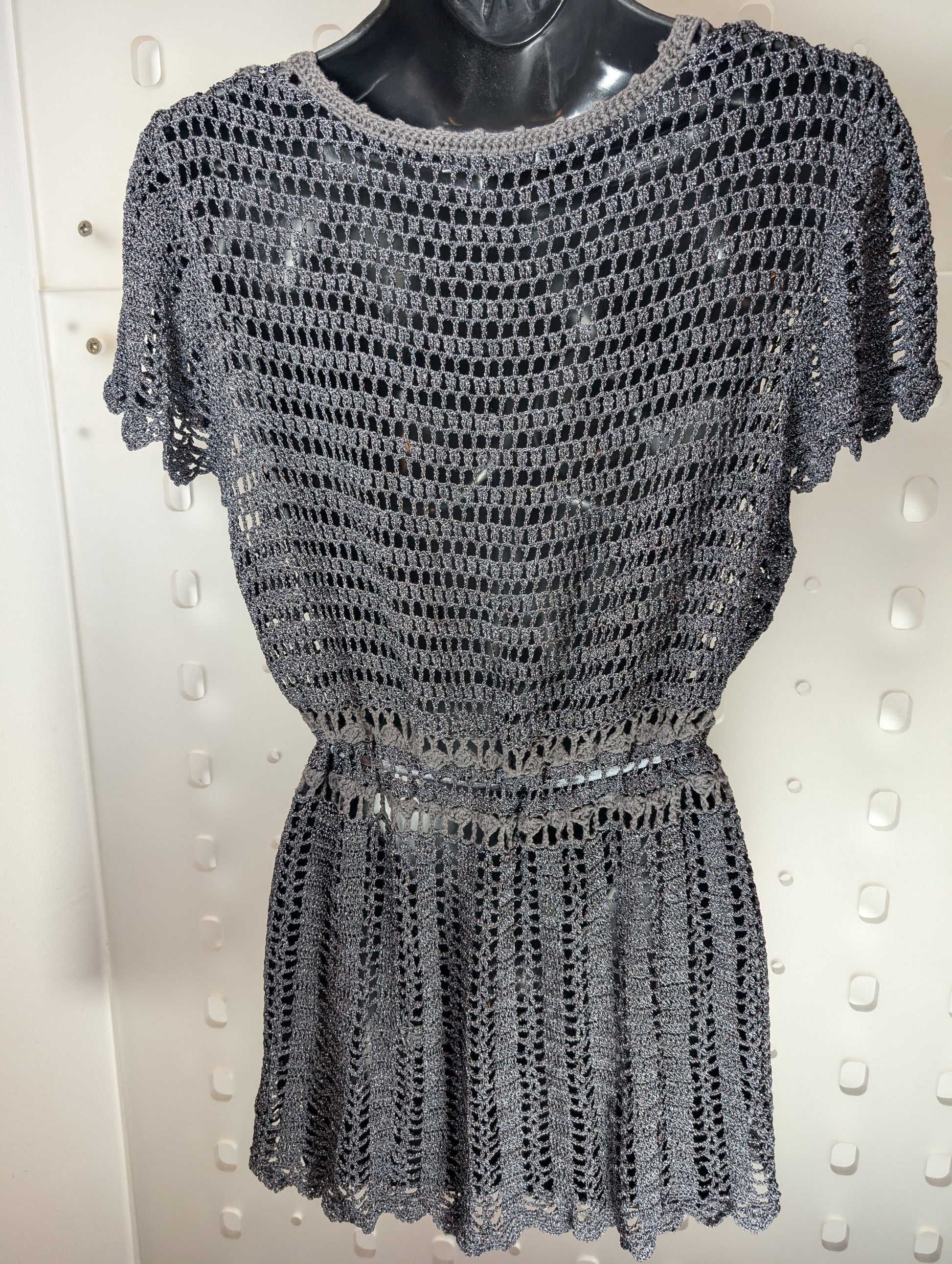 Chic crochet top in a soft silver tone with delicate grey crochet ribbon detailing. Designed with flattering cap sleeves and a tie waist that cinches the silhouette beautifully. Lightweight and easy to style, this piece works just as well dressed up with tailored trousers as it does worn casually with denim.