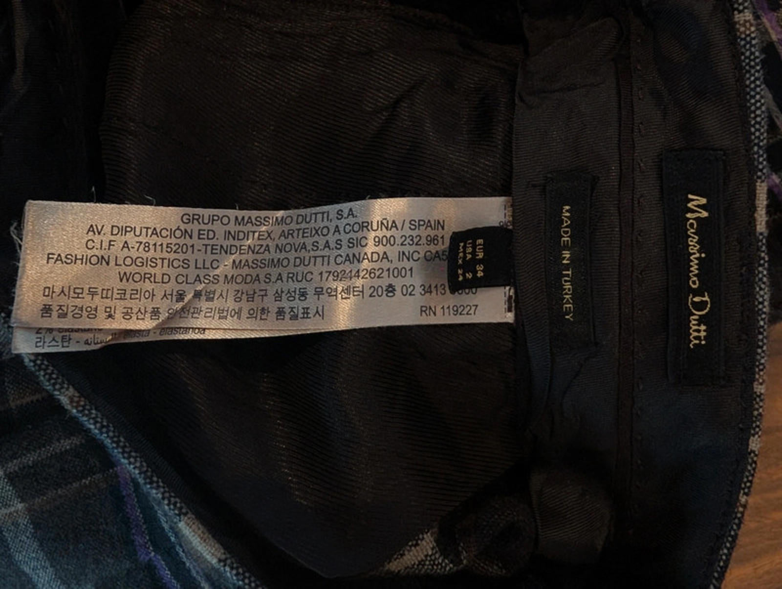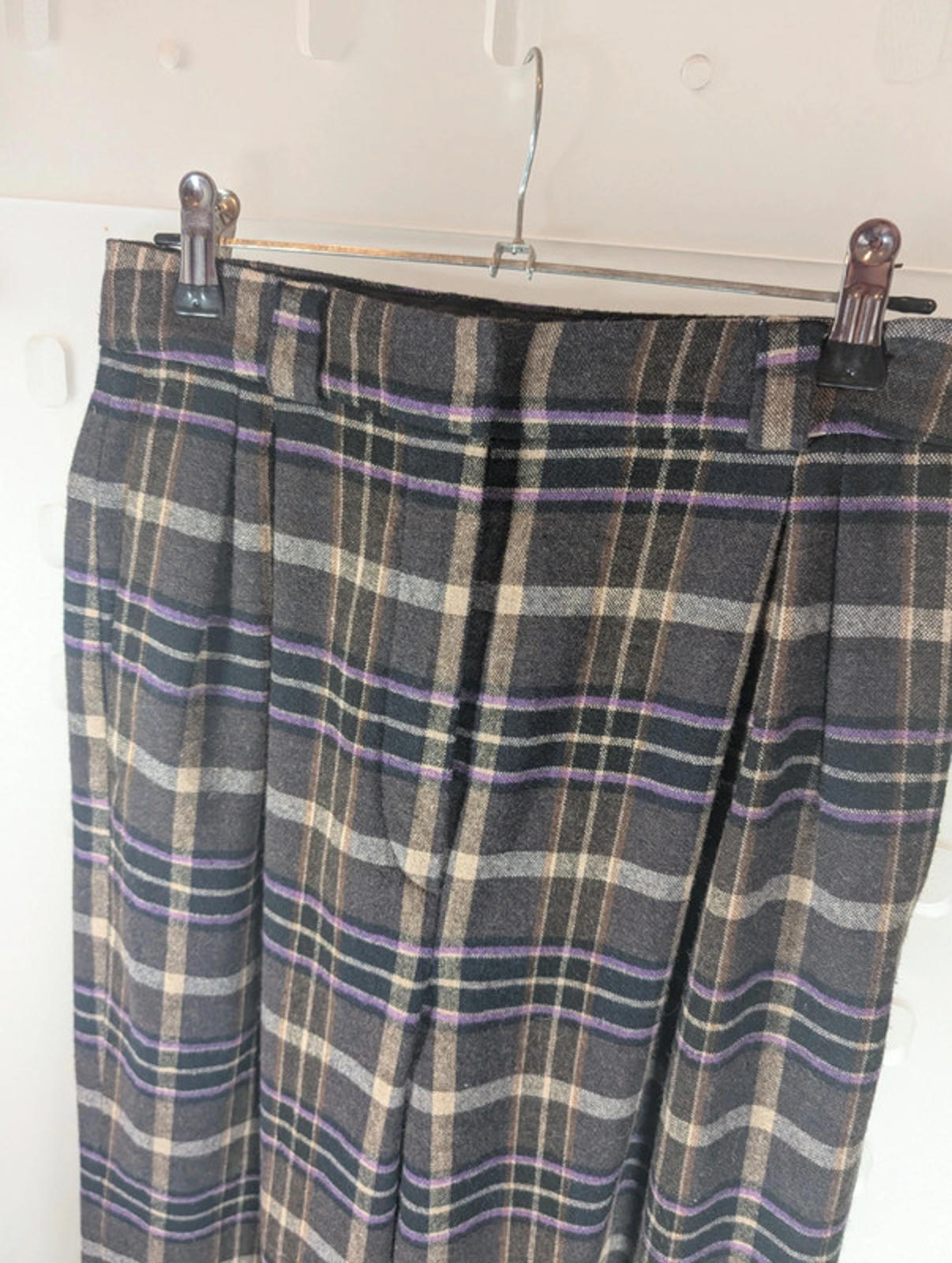 Stunning Massimo Dutti tailored trousers in a classic grey, beige, and purple plaid check. These have a perfect 90s vintage silhouette with a high-waisted pleated front and a wide straight leg. High-quality construction, made in Turkey.