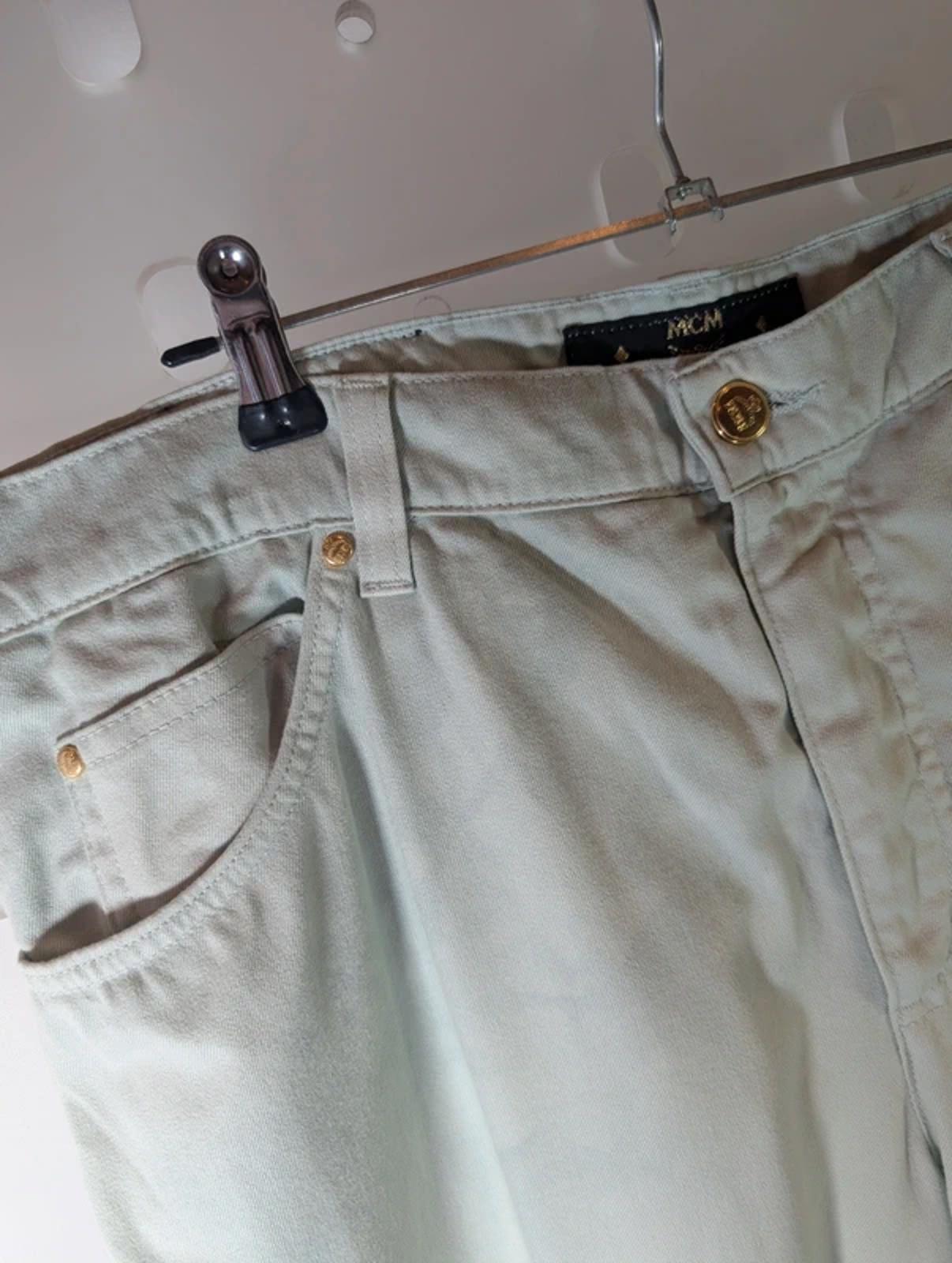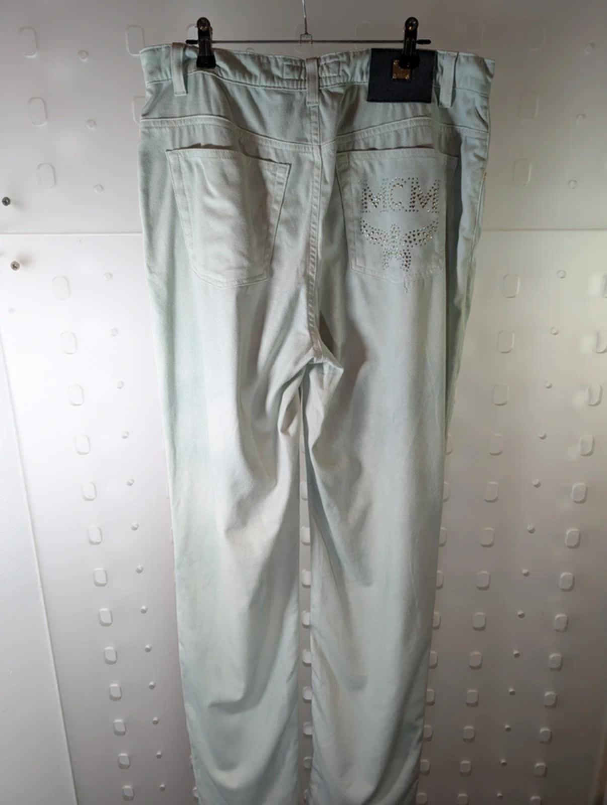 Soft, lightweight mint green MCM jeans with a comfortable cotton stretch fabric and signature decorative MCM back pocket detailing. A standout spring/summer piece with a relaxed, premium feel.