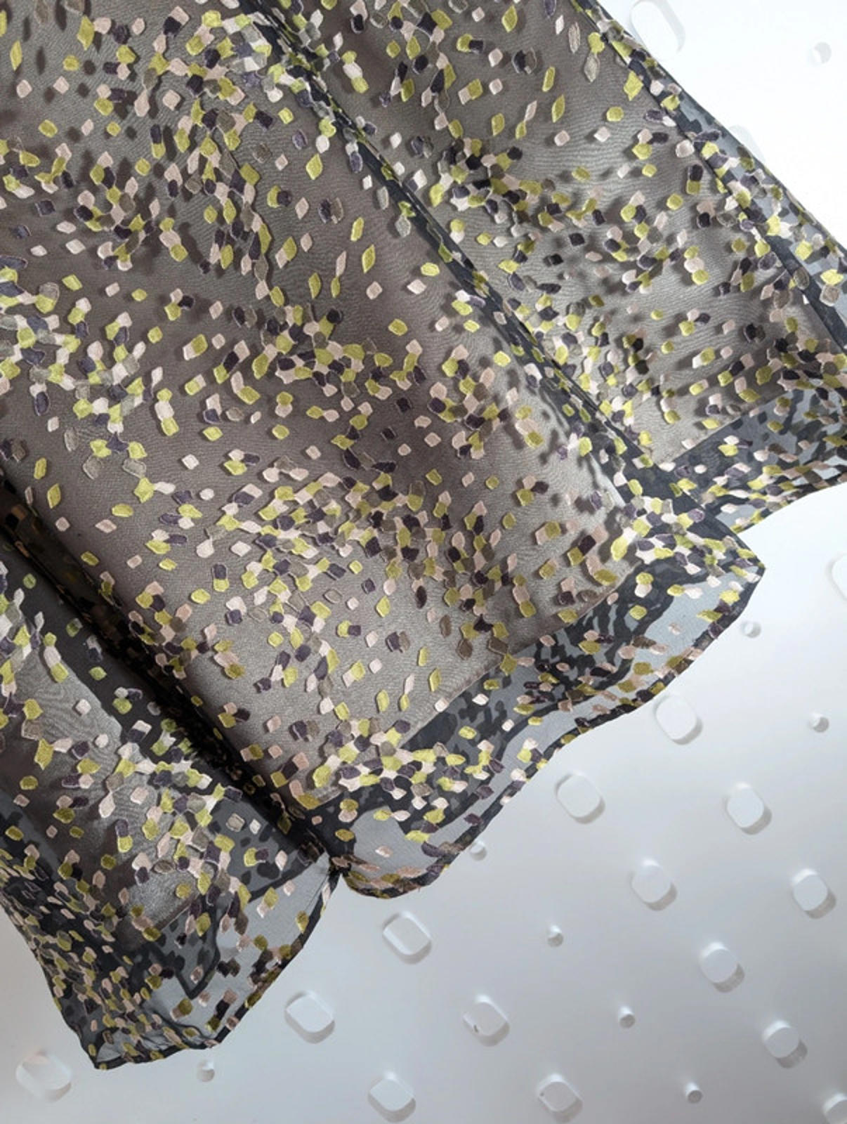 Beautiful drapey fabric in a textured geometric pattern with hints of green, grey and black. The viscose–silk blend gives it a soft, floaty movement — perfect with boots and a knit for winter, or dressed up for evenings.