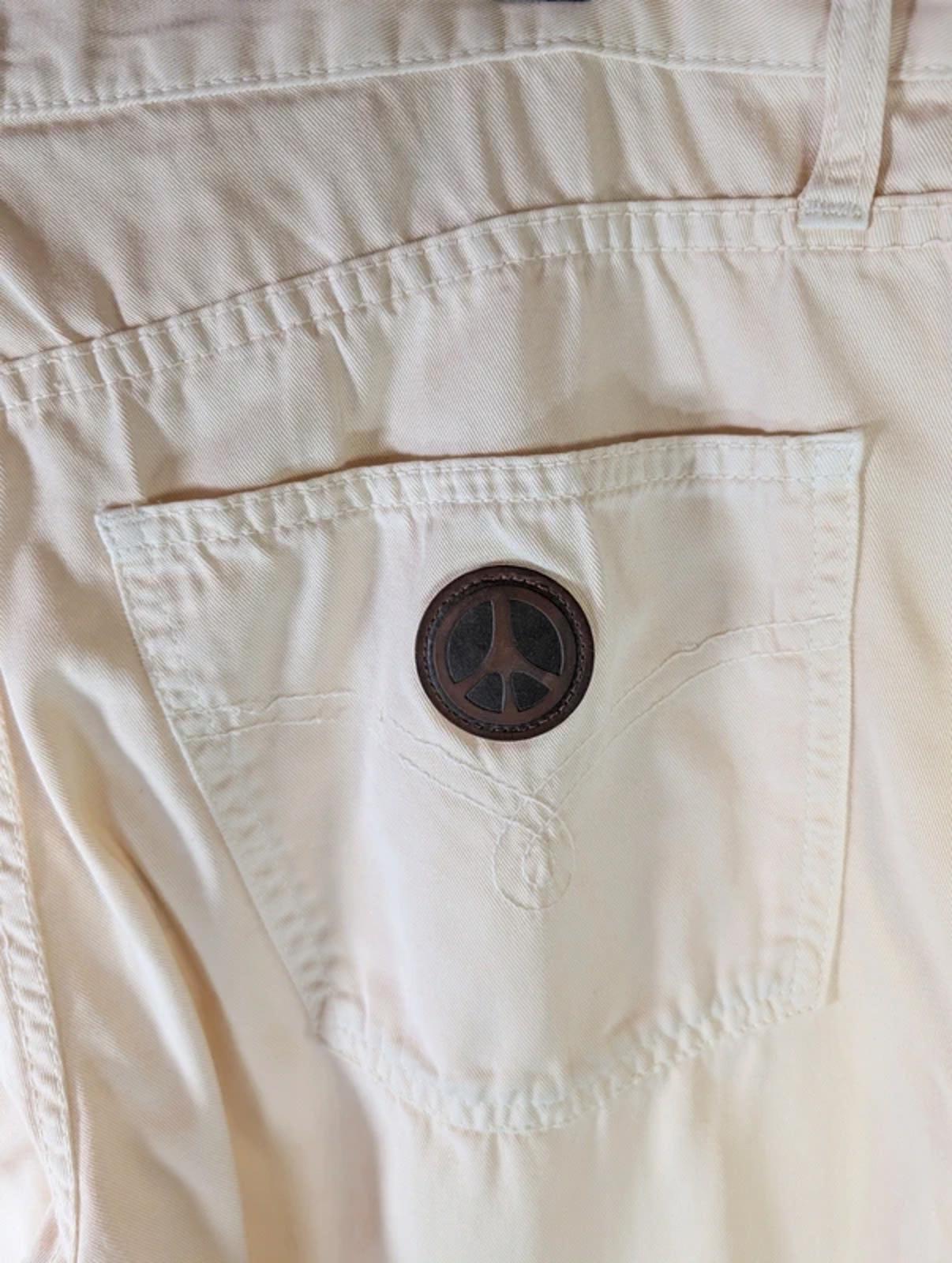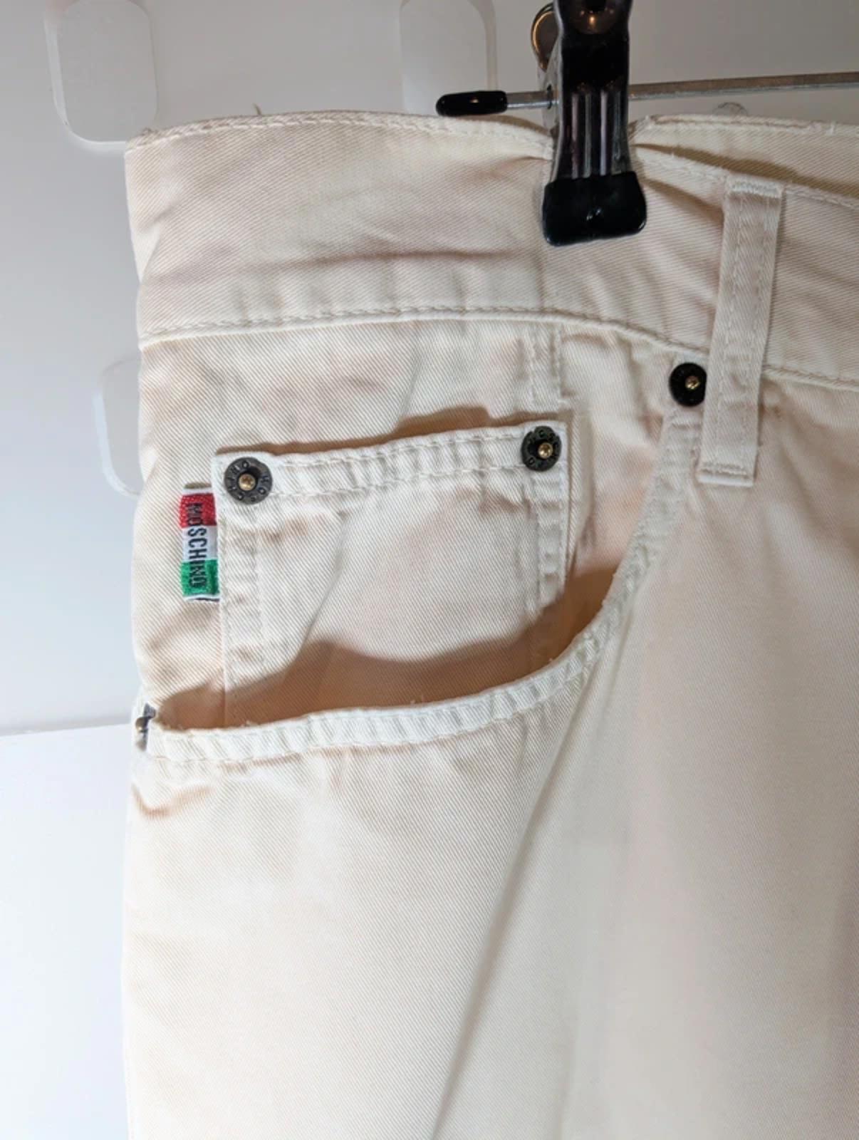 Authentic Moschino cream denim jeans with classic straight/regular leg shape. A great transitional piece for spring, easy to style with knits, polos or light jackets.