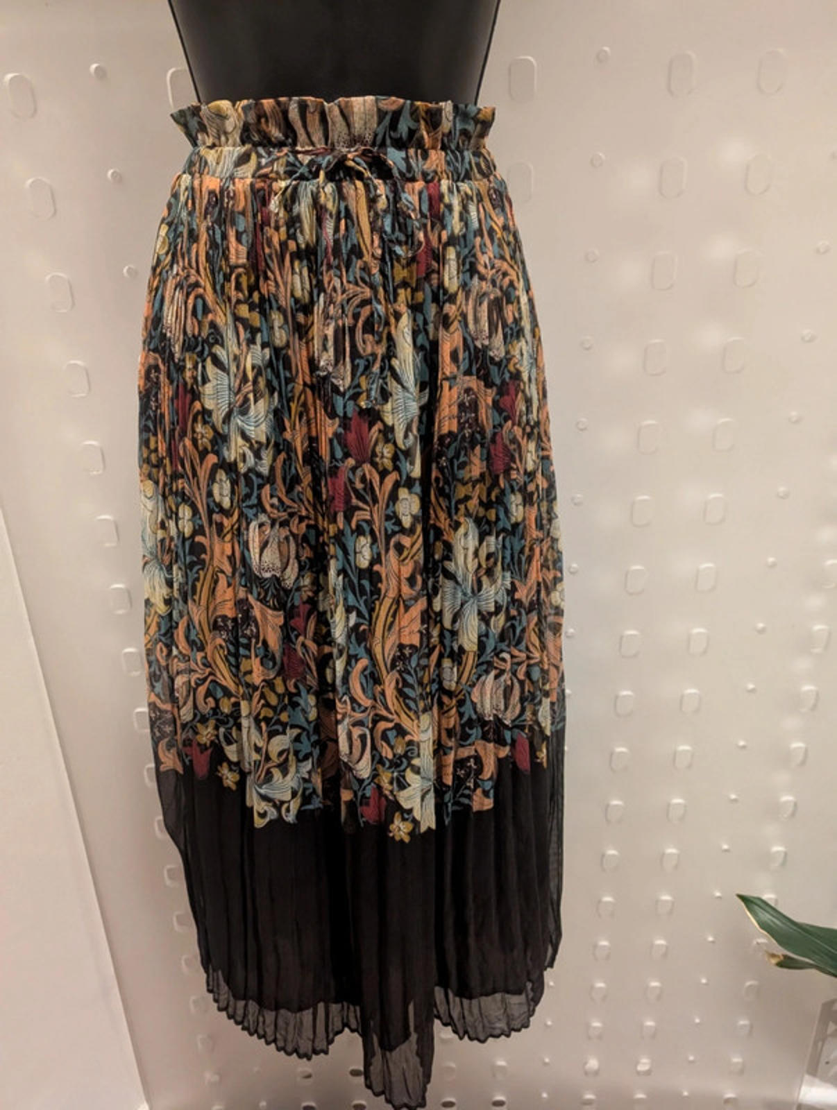 Beautiful designer collaboration piece from Next x Morris & Co., featuring their iconic Arts & Crafts inspired print in rich autumnal shades of teal, rust, mustard, and black. Lightweight pleated chiffon with a contrast brown hem and soft lining. The elasticated waistband has a tie detail and subtle ruffle trim for a flattering, feminine finish.