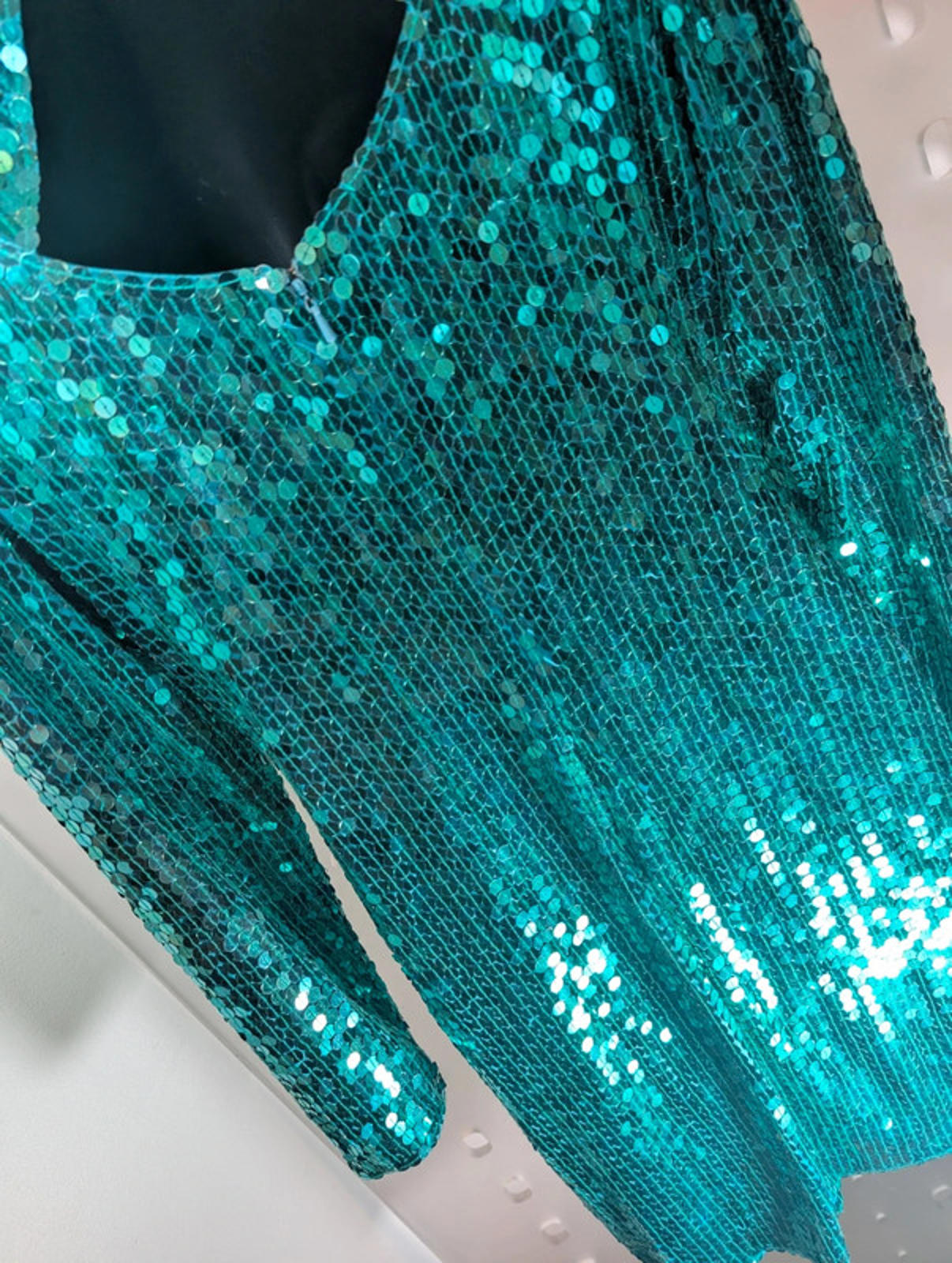 The sleeves show slight fading from age (classic for turquoise dyes) — tricky to photograph but worth noting. A few loose sequins here and there, completely expected for true vintage, but nothing that affects the overall impact.