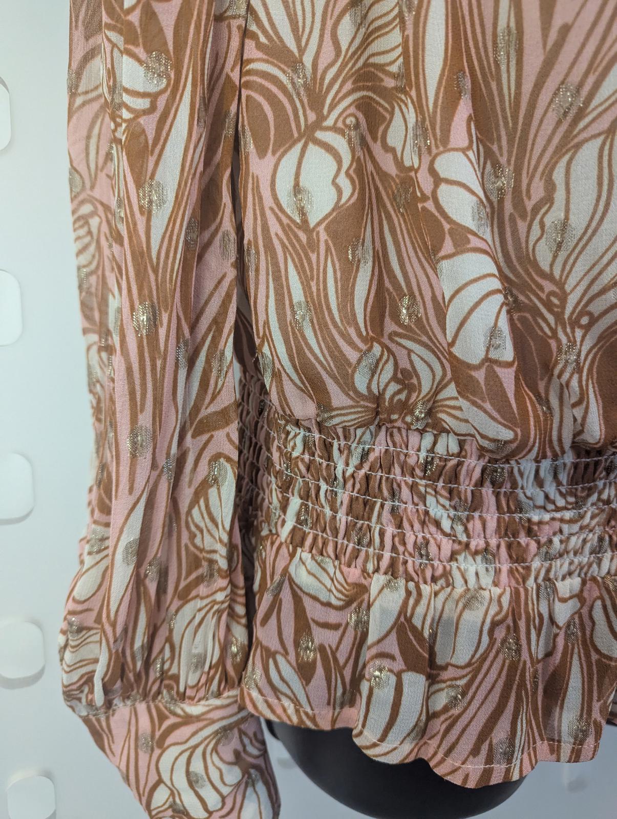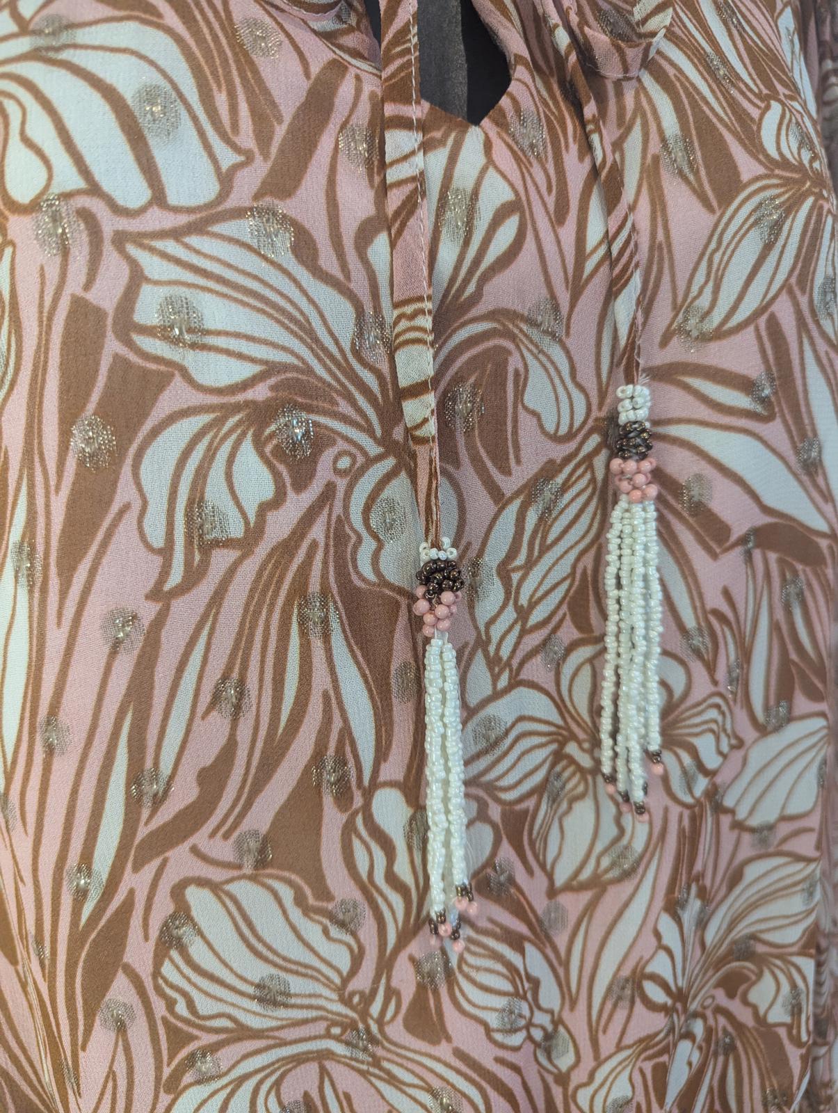 Elevate your wardrobe with this gorgeous floral smock top, perfect for any occasion. Crafted with lightweight fabric, it features a viscose lined bodice, stunning floral pattern in soft tones of pink and brown, enhanced with subtle sparkles. Key features include: - Elasticated hem for a flattering fit - Tassel detailing with beads for added charm - Flowy sleeves that offer comfort and style - Versatile design suitable for pairing with jeans or skirts. Make a fashionable statement this season with this eye-catching piece! Size Small - UK10 - RRP£65