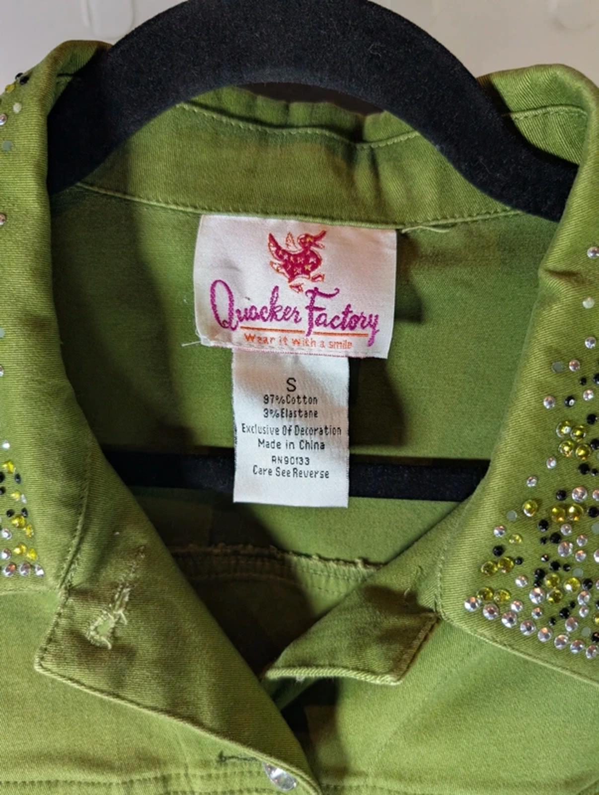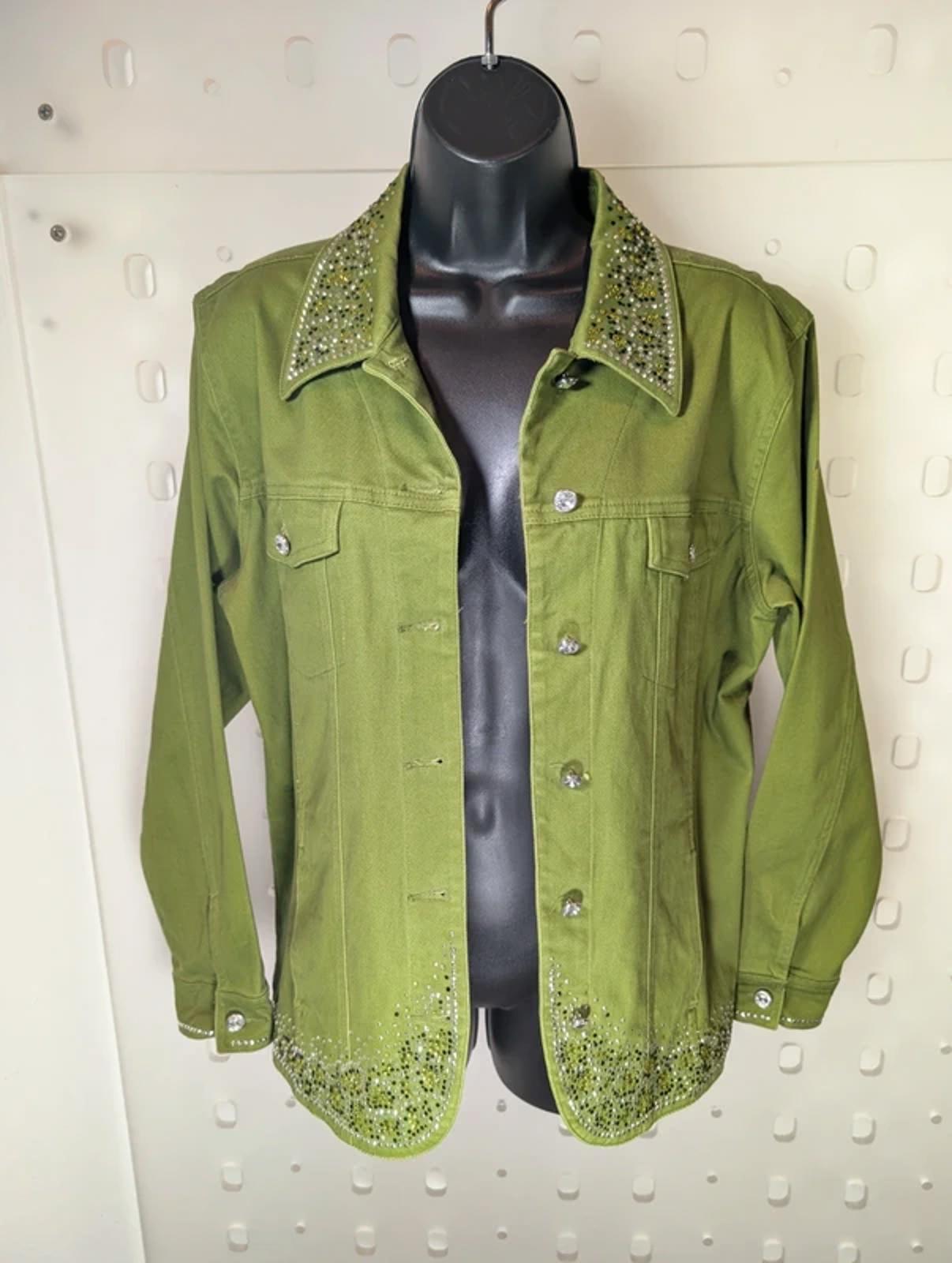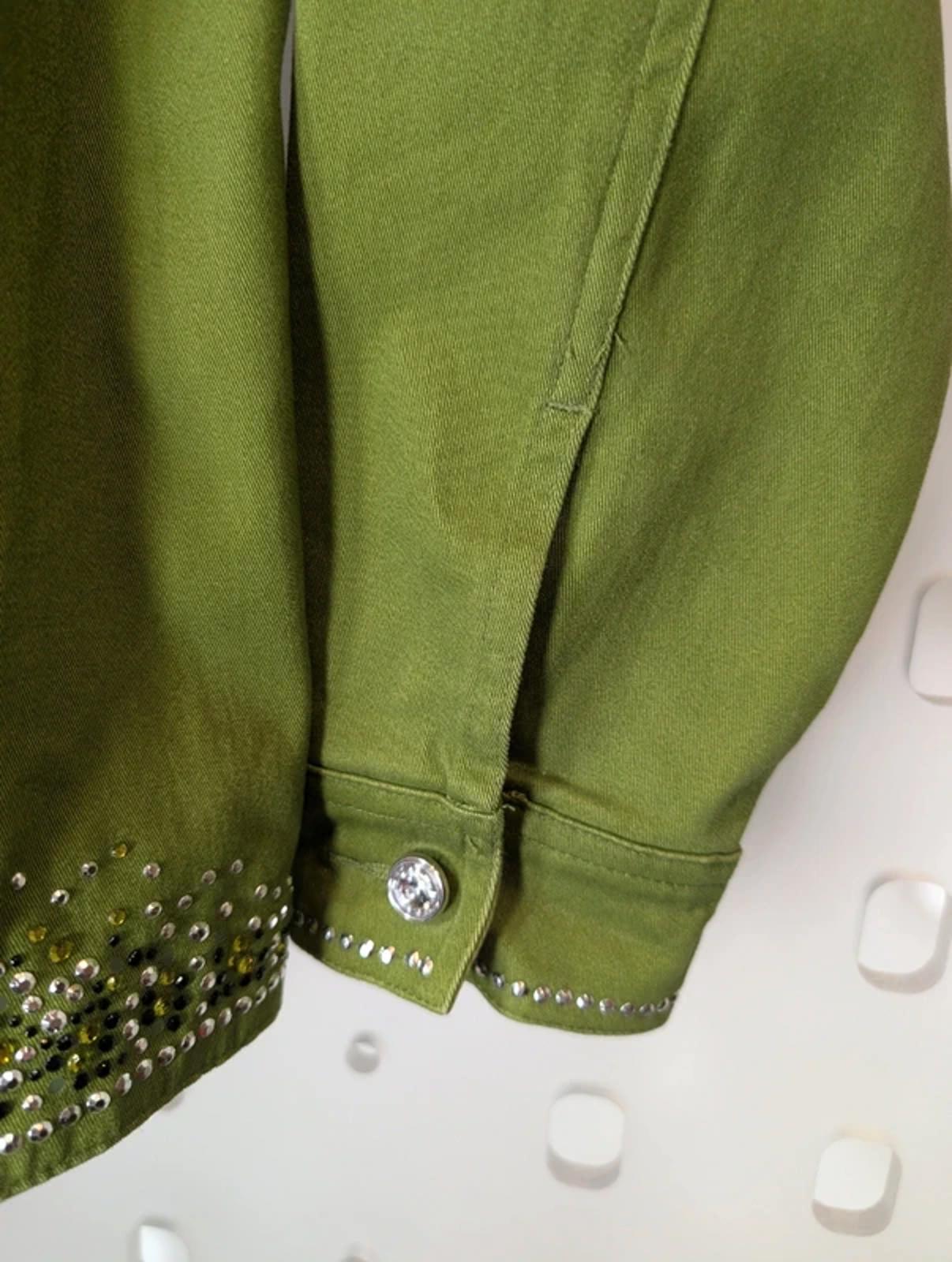 Classic denim-style silhouette elevated with silver, black and green rhinestone embellishment and bold crystal-look statement buttons. Playful, eccentric and full of personality.