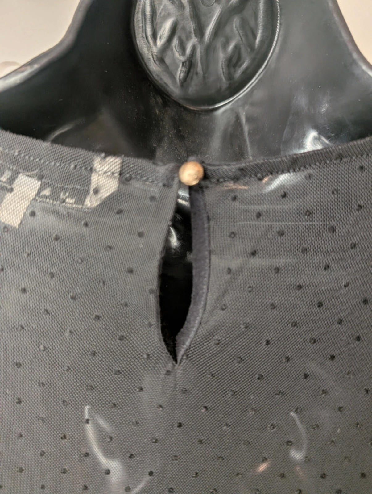 Beautiful, high-quality designer blouse by Silvian Heach. Features intricate sheer dot mesh fabric with finely pleated detailing and frilled cuffs. The sleeves and upper chest are semi-sheer, with lining beginning from the bust line for a delicate, layered effect.