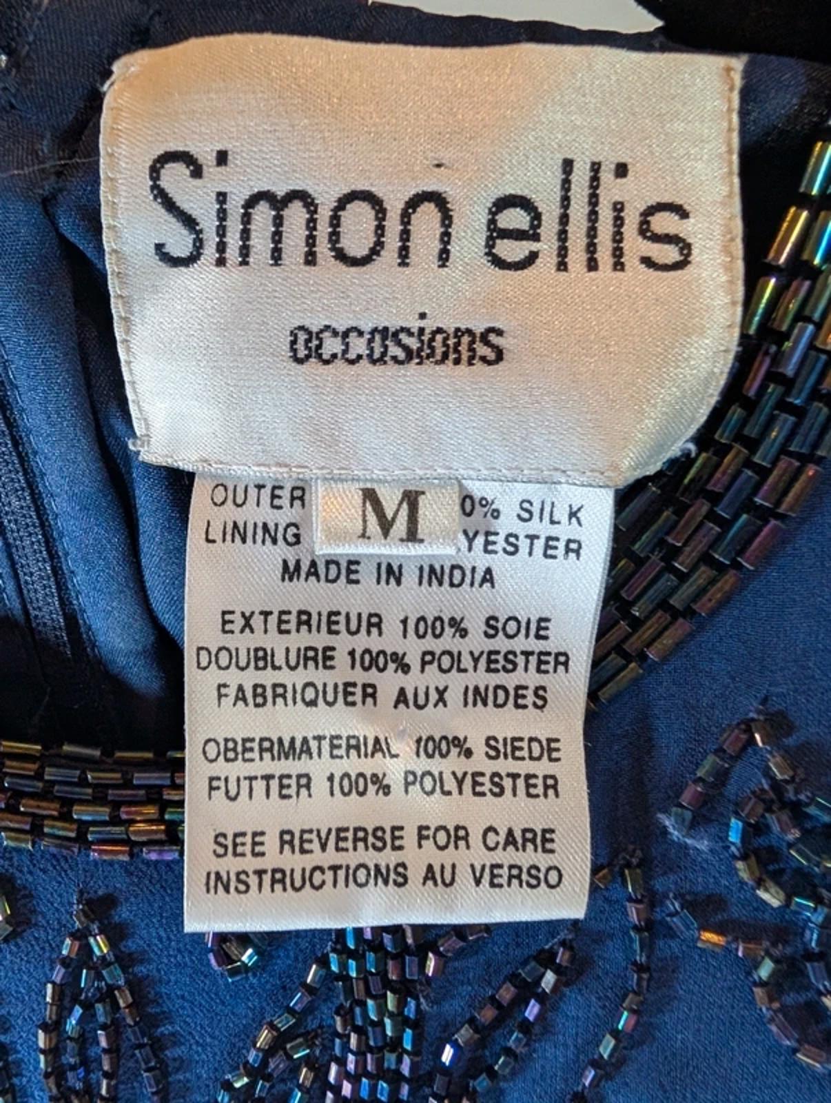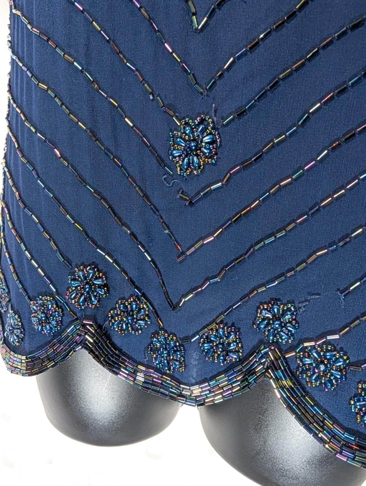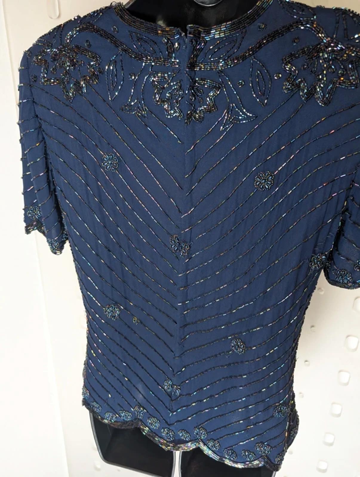 Elegant vintage evening top by Simon Ellis featuring intricate iridescent beadwork on deep navy silk. Structured shoulders with shoulder pads and a centre back zip fastening create a flattering evening silhouette.