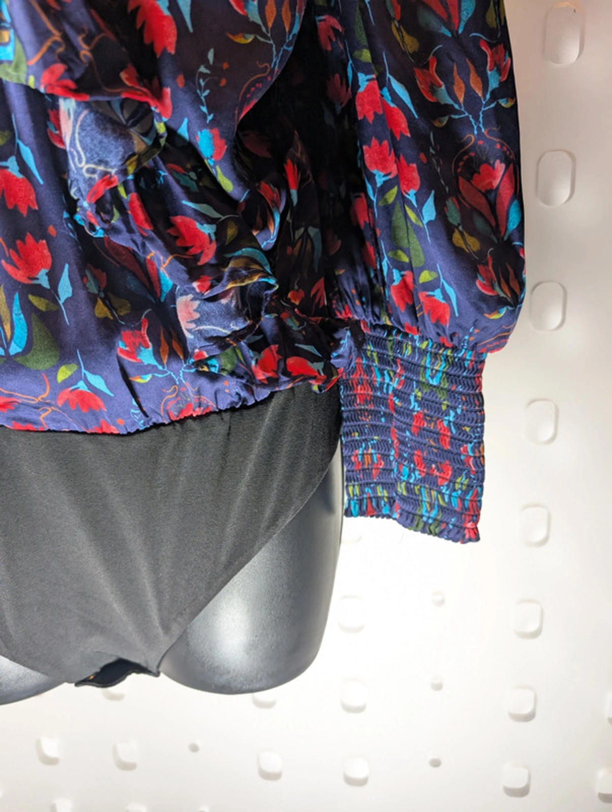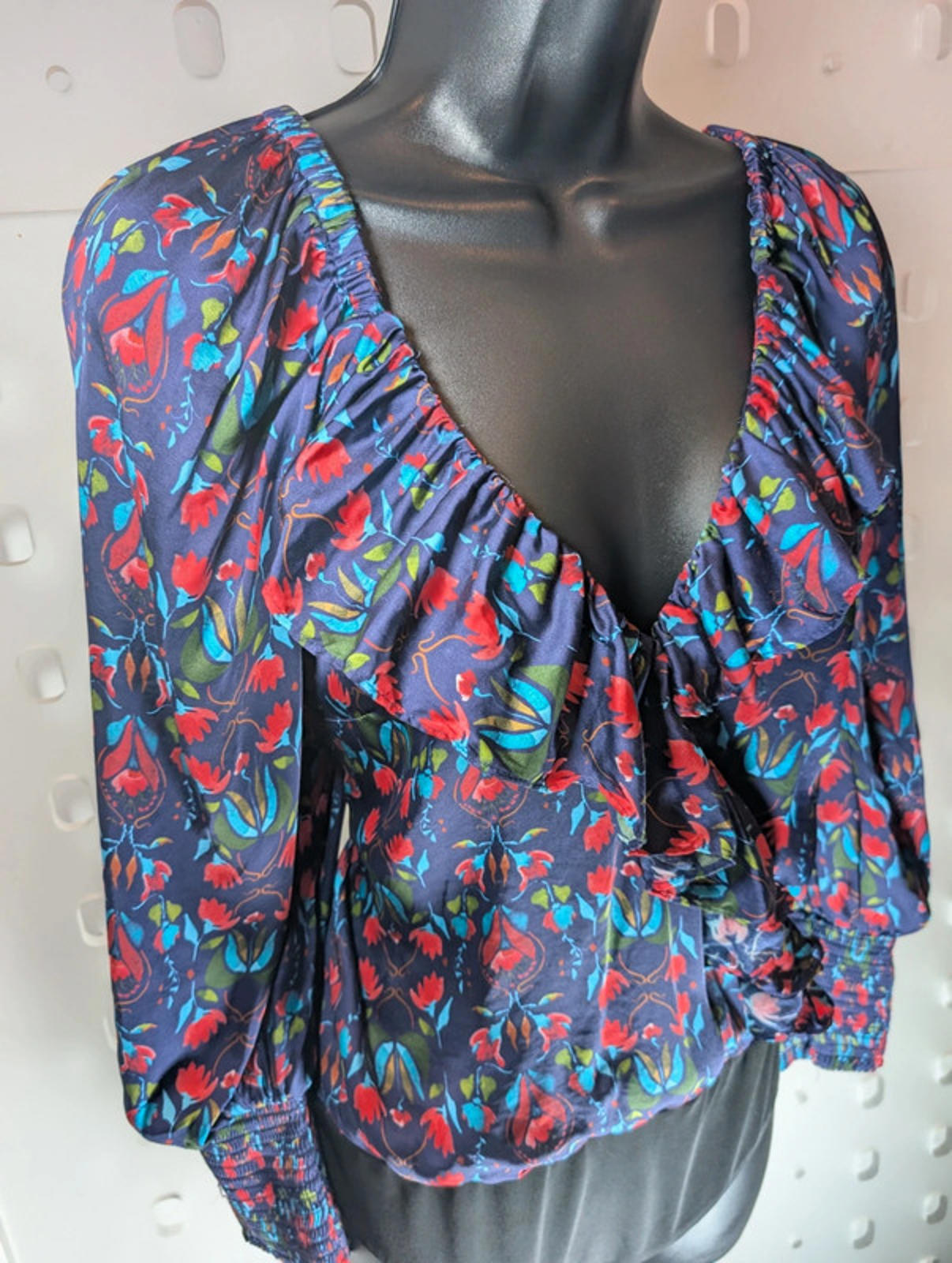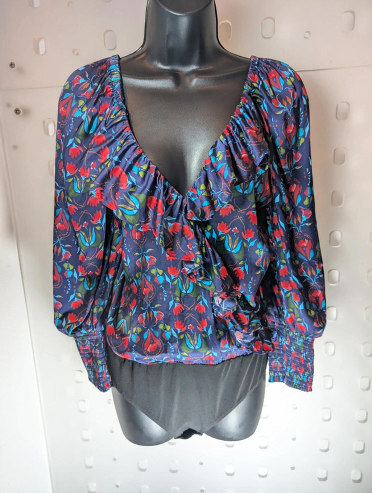 Beautiful and rare hand-painted floral print, with this piece being 1 of only 100 ever made. Deep V neckline with soft ruffle detailing, shirred cuffs and a flattering, blousey silhouette that tucks neatly thanks to the bodysuit base.