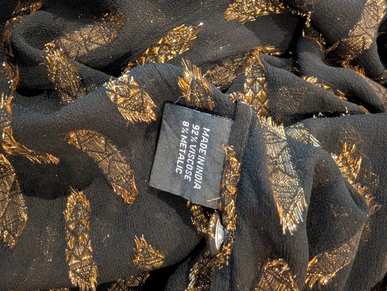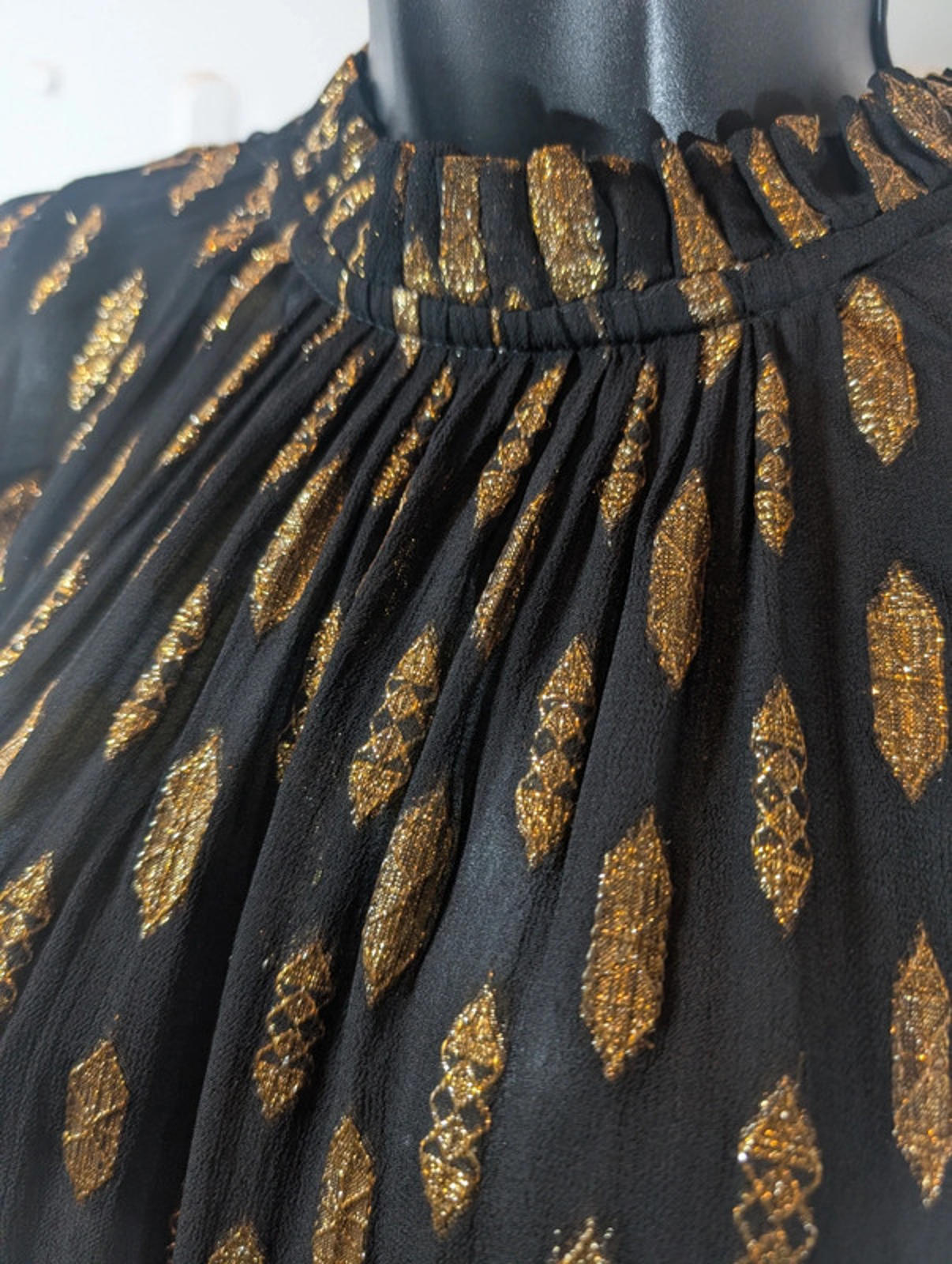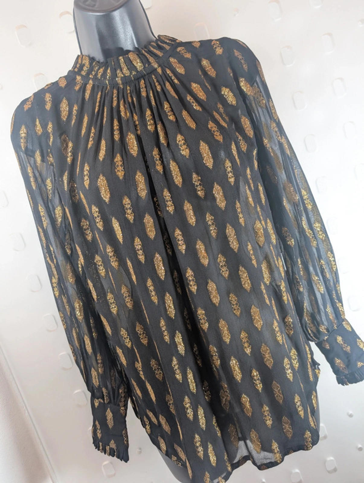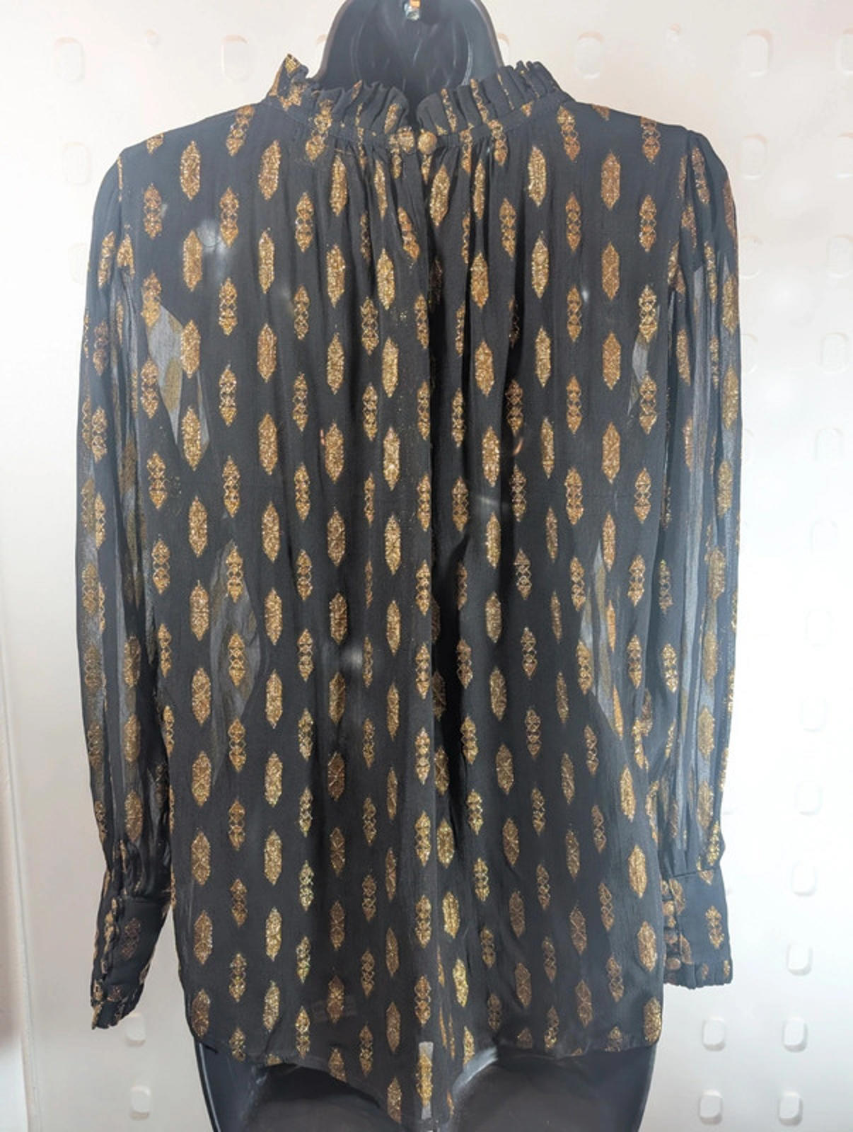 Sheer black fabric from top to hem, scattered with gold embroidered motifs. Elegant with just the right amount of subtle, sexy sheerness — gorgeous layered over a black cami or worn boldly on its own. Floaty silhouette with a gathered neckline and a single button fastening at the centre back. Full sheer sleeves with soft volume and frilled cuffs.