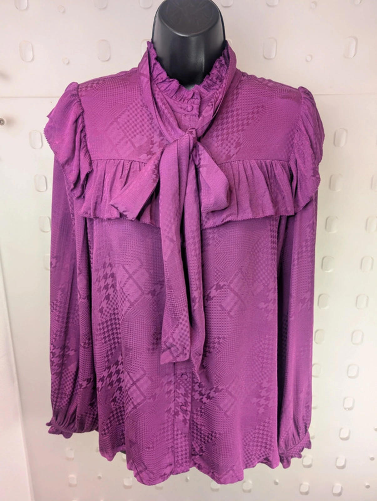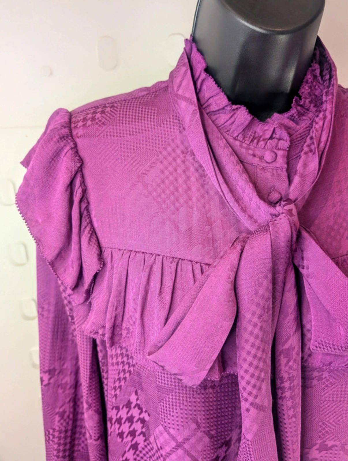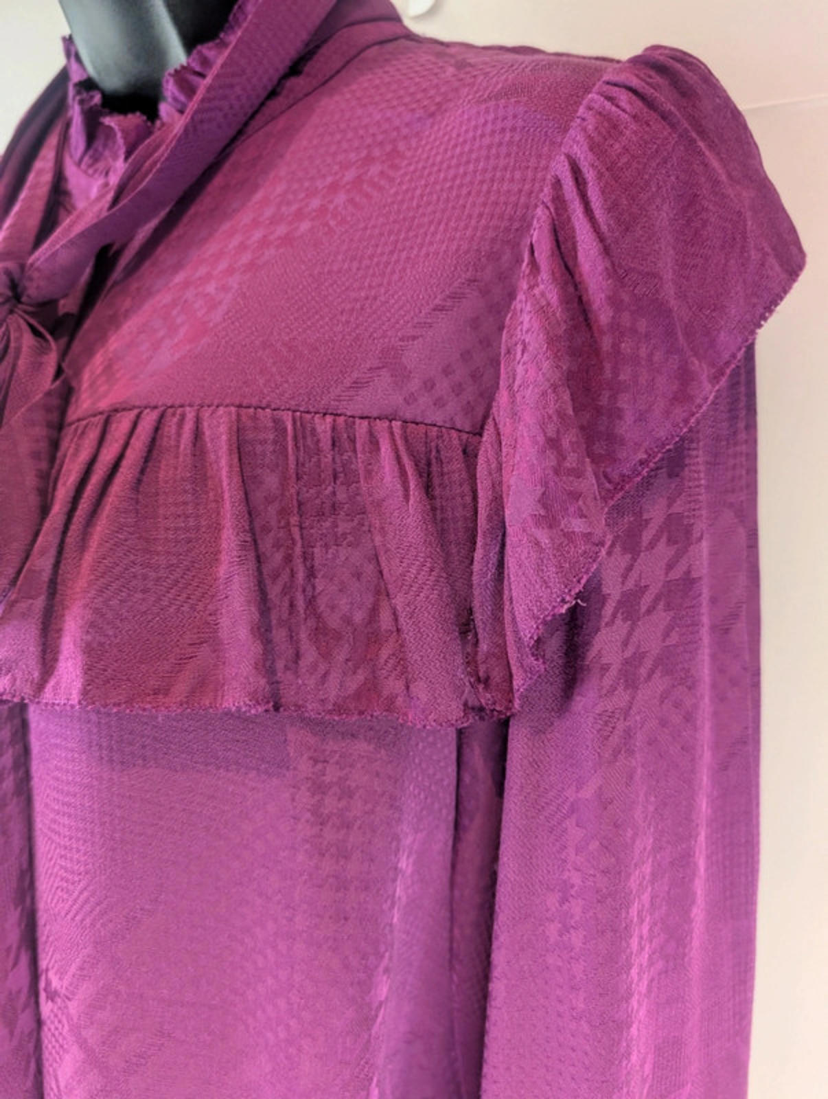 Beautiful quality blouse by French brand Suncoo Paris in a rich purply-pink jacquard fabric with subtle geometric texture. Features soft frill details across the chest and shoulders, long sleeves with gathered cuffs, and a removable tie neck for versatile styling. Feminine, flattering, and premium quality — the kind of piece that feels instantly special.