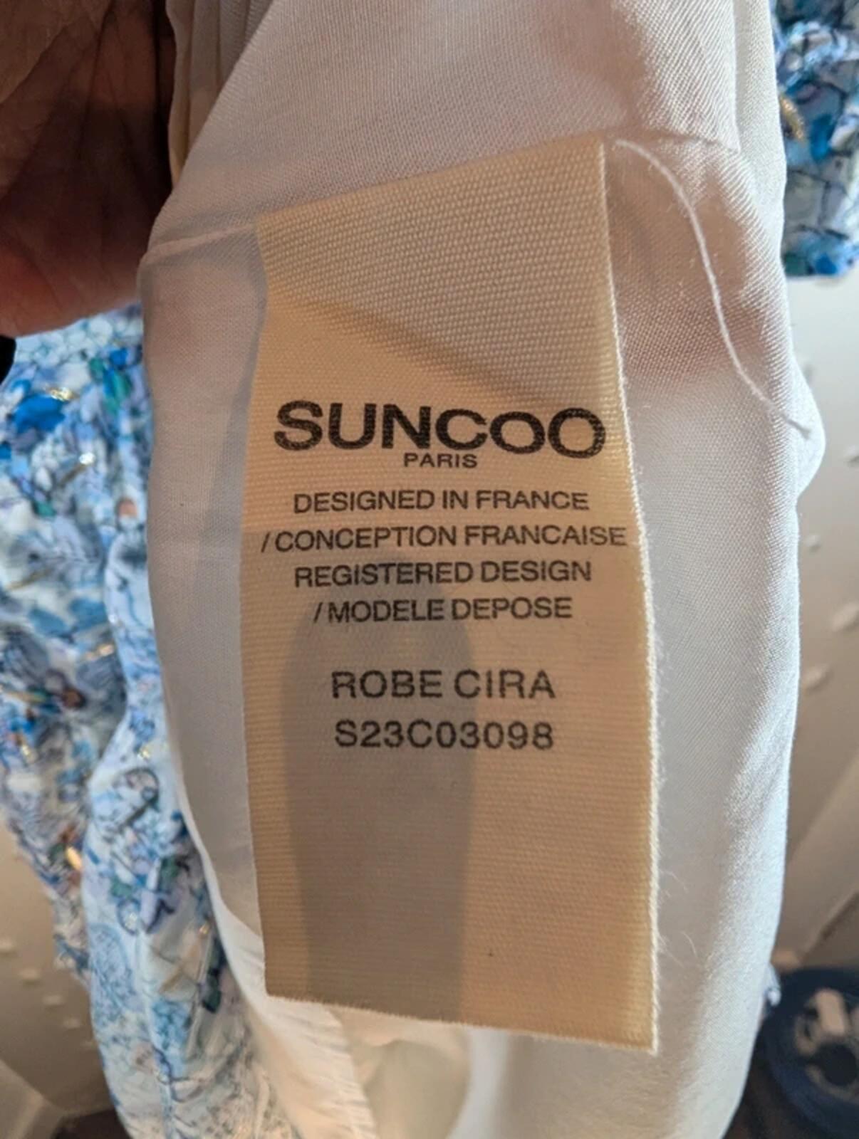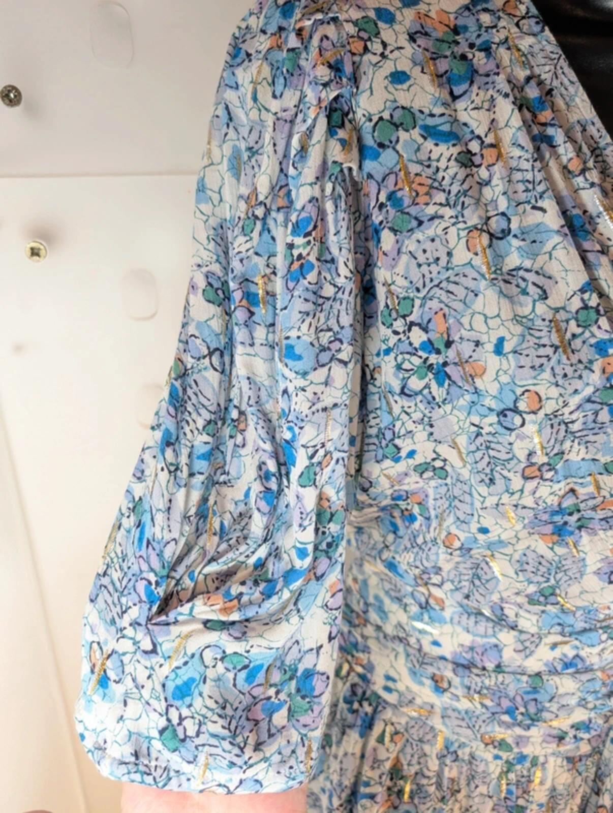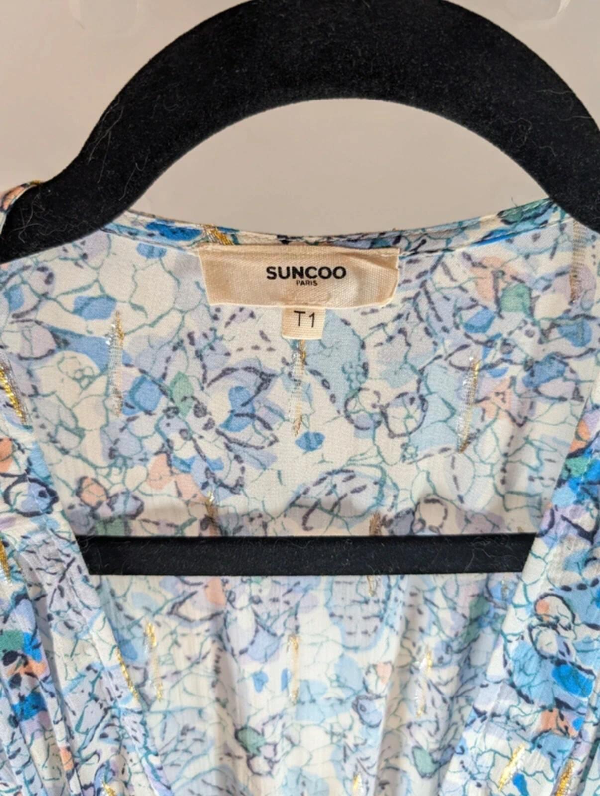 Beautiful Suncoo ‘Robe Cira’ dress in a softly textured viscose blend with subtle metallic silver and gold thread running through. Flattering ruched waistband with a wrap-style bodice and layered skirt for movement. Lined through the body for comfort with sheer sleeves adding a light, elevated feel. Effortless Parisian occasion piece — perfect for weddings, parties or dressed down with boots.