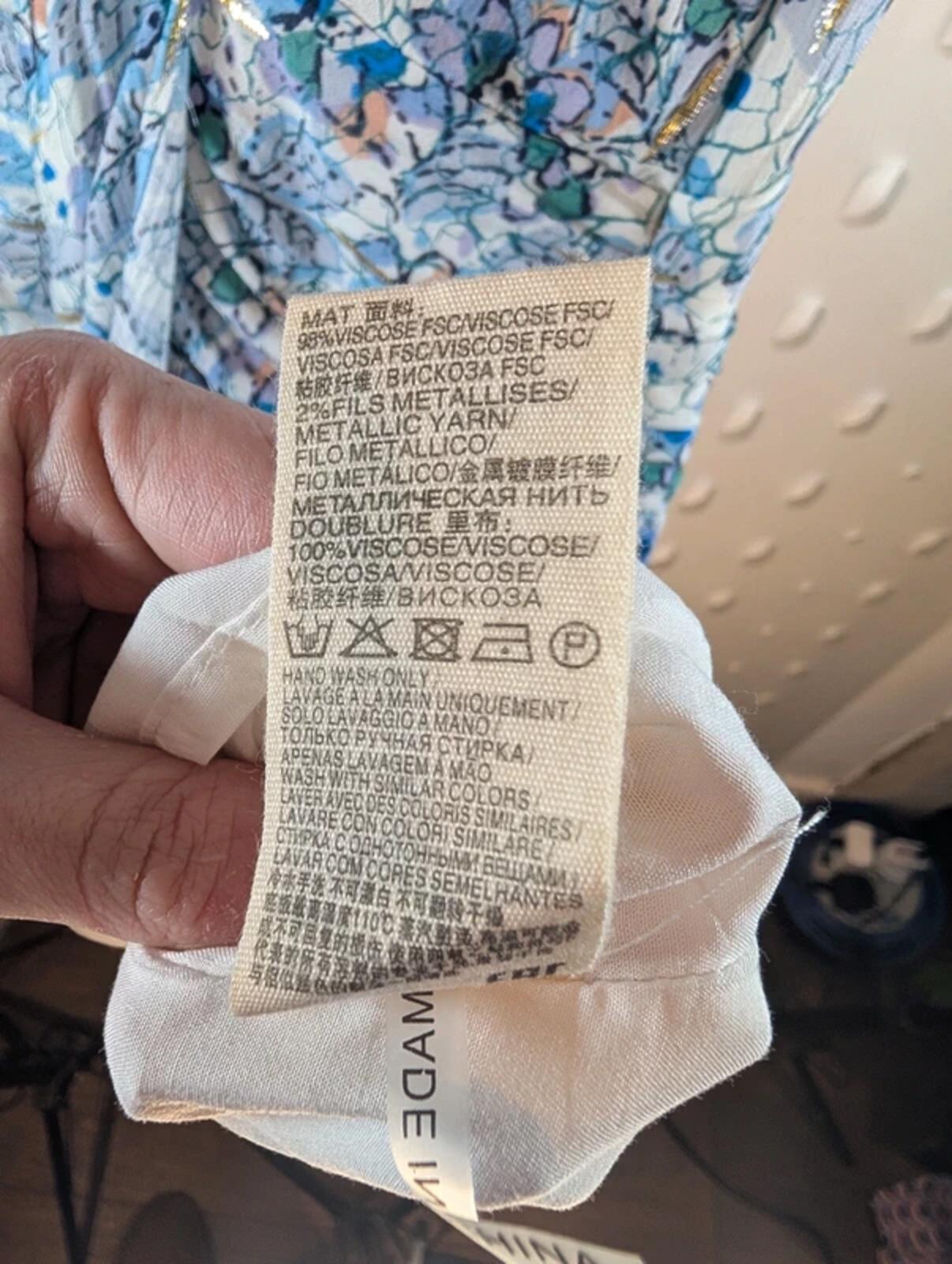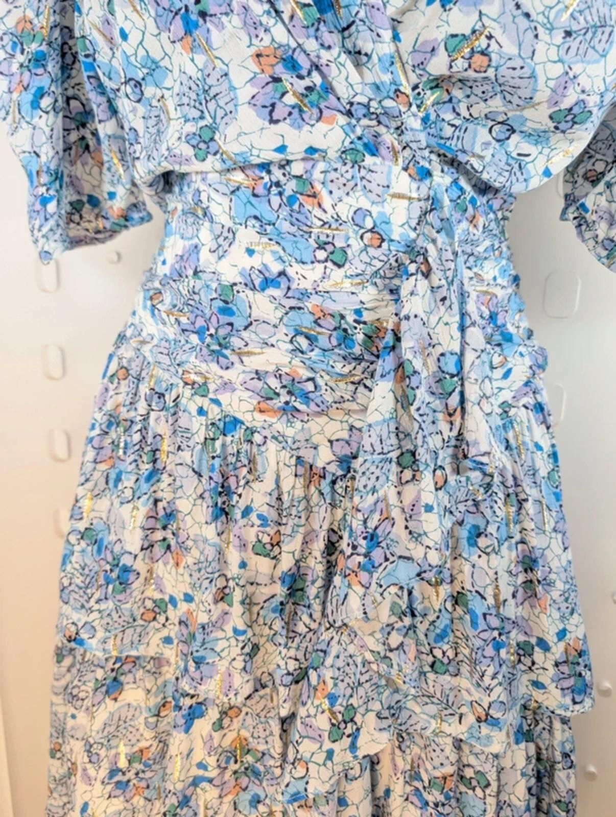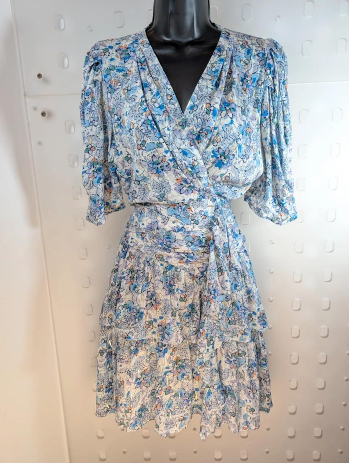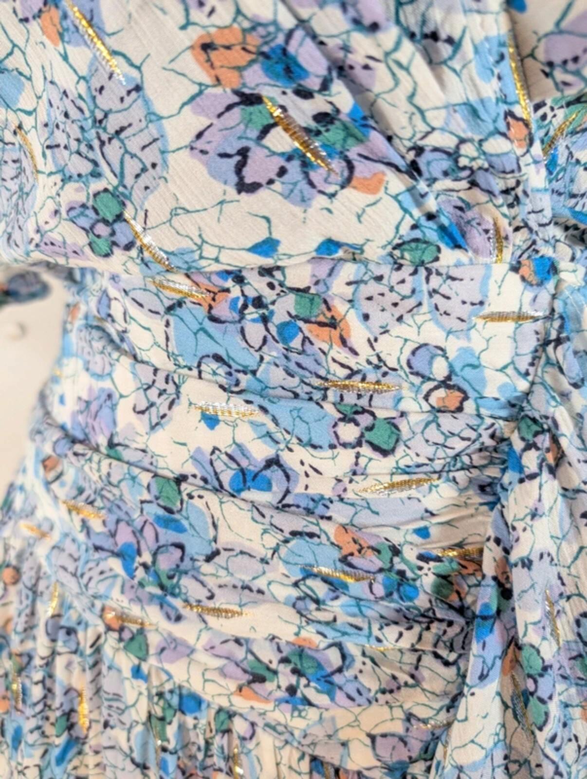 Beautiful Suncoo ‘Robe Cira’ dress in a softly textured viscose blend with subtle metallic silver and gold thread running through. Flattering ruched waistband with a wrap-style bodice and layered skirt for movement. Lined through the body for comfort with sheer sleeves adding a light, elevated feel. Effortless Parisian occasion piece — perfect for weddings, parties or dressed down with boots.