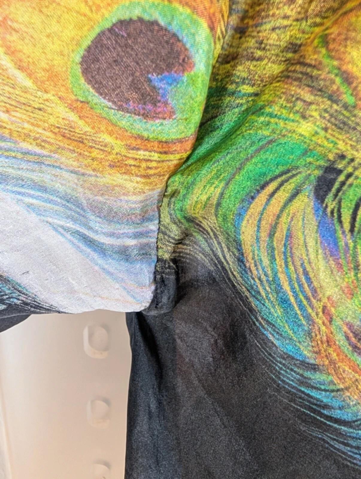 Stunning Supertrash blouse in an ultra-fine, lightweight silk with an iridescent peacock feather print that subtly shimmers in the light. Sheer, delicate and floaty with a tie neckline and full button-through front — beautiful worn loose or open over layers.