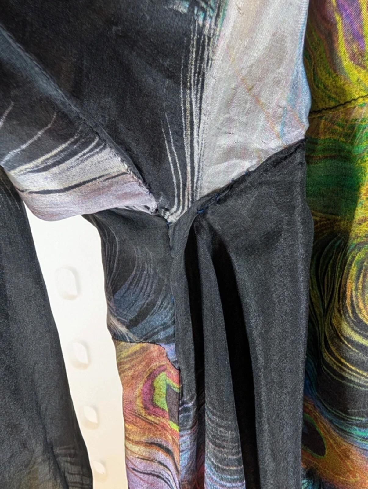 Please note this is a very fine silk and has had some stress across the back seams. These have been carefully repaired, leaving a small tuck near the underarm (shown). Reflected in price — still an incredibly striking piece, best suited to a petite fit or worn open to avoid further strain.
