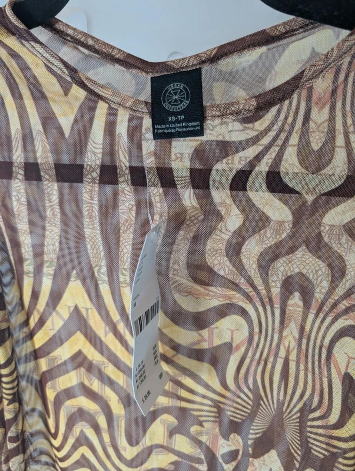 Sheer mesh statement top from Urban Outfitters with cold shoulder cut-out detail and abstract brown tribal print. Lightweight stretch mesh that layers beautifully over a bralette or cami. A great Y2K inspired piece that works with denim, leather or tailoring.