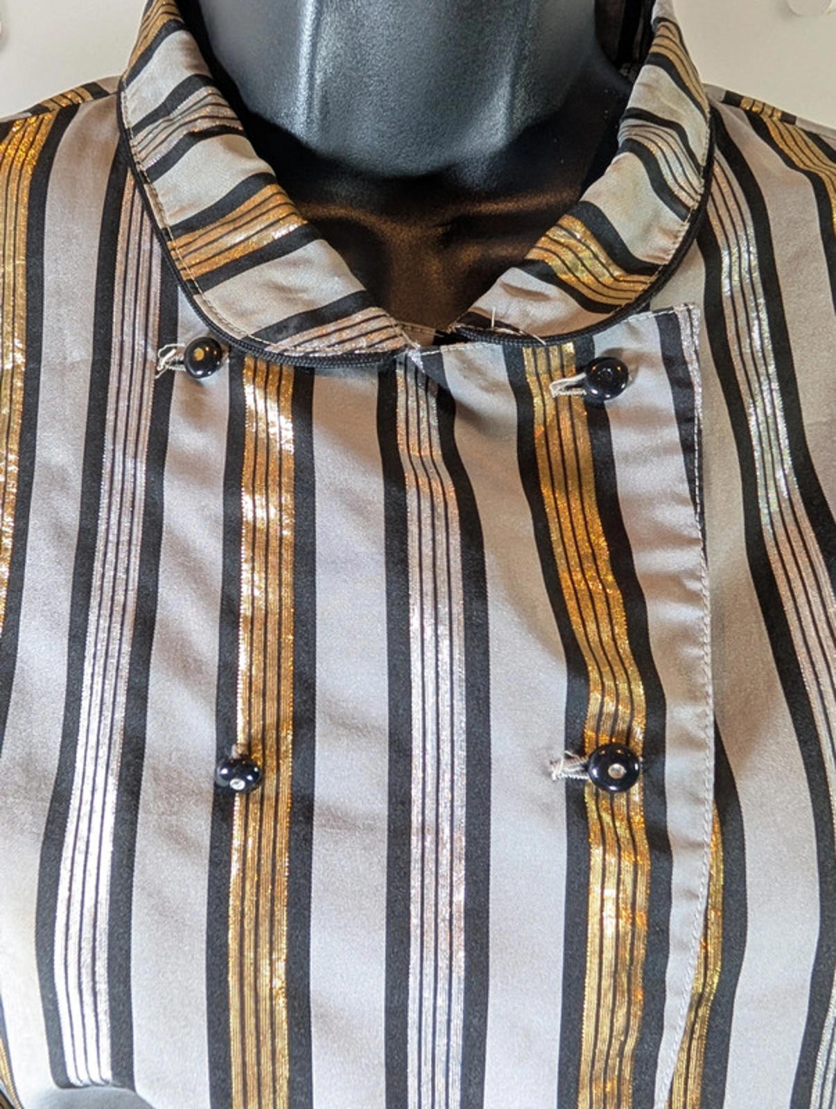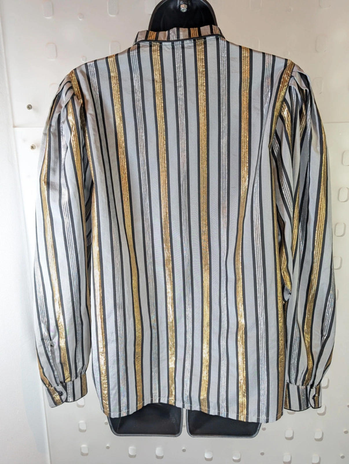 Vintage 1980s maximalist metallic statement blouse in grey, black, silver and gold with dramatic oversized sleeves and a crisp structured fabric for maximum volume. Strong shoulders, bold shine and a true power-blouse silhouette.