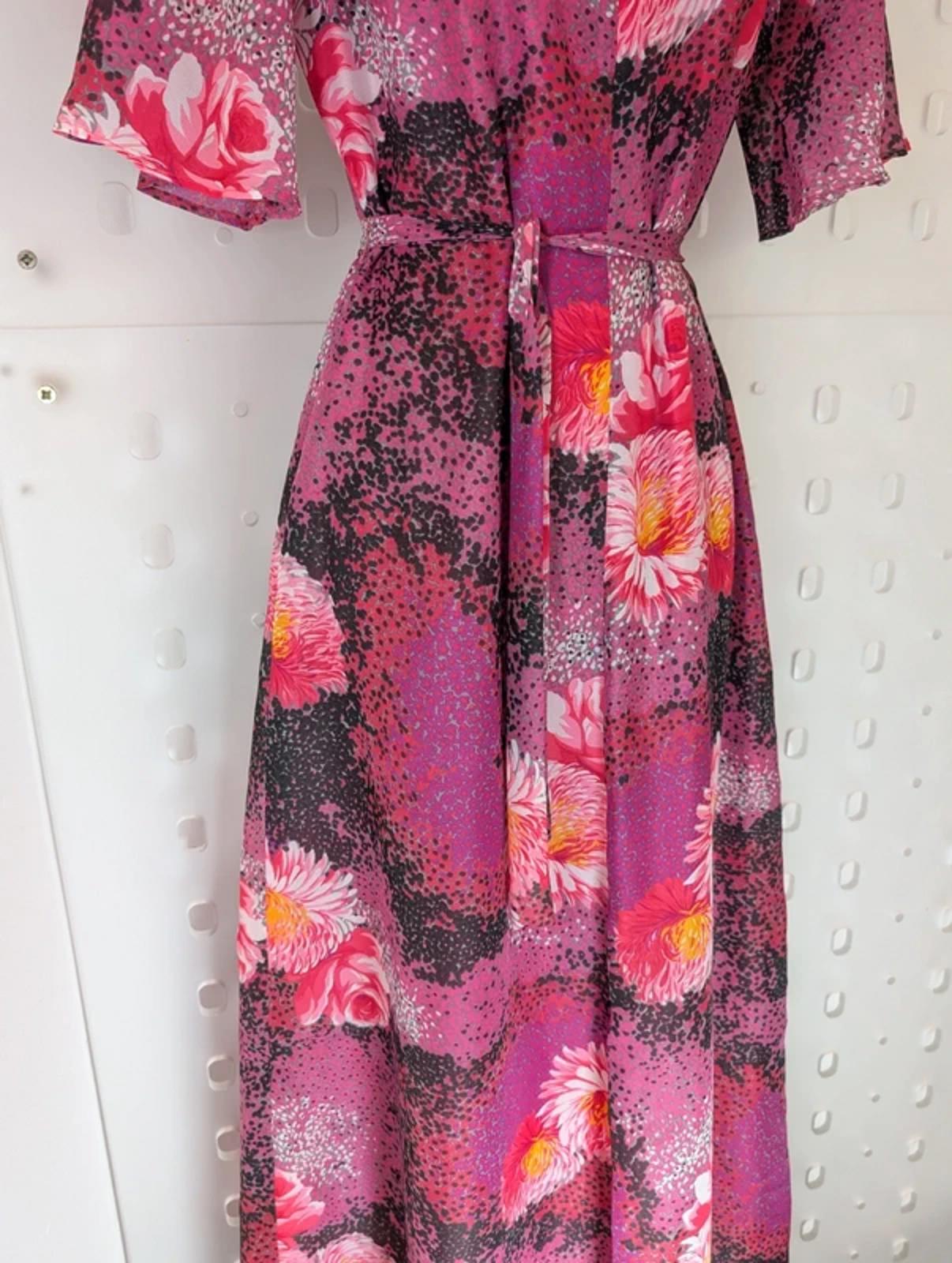 Beautiful vintage 1970s maxi dress in vibrant pink floral print with delicate flutter sleeves and flattering v neckline. Soft flowing silhouette with tie waist to adjust the fit. Fully lined with centre back zip fastening. A stunning boho piece perfect for holidays, summer events or festival styling.
