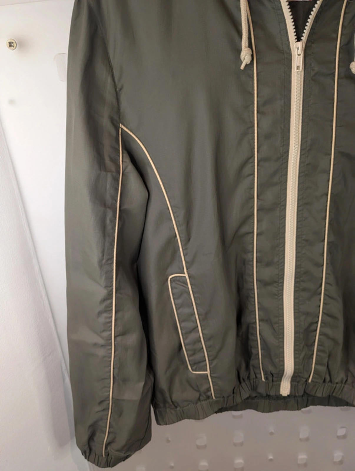 Classic Britpop-era Topman windbreaker in khaki with off-white contrast piping. Lightweight nylon shell with zip fastening, drawstring hood, elasticated cuffs and hem. A great retro piece with that unmistakable 90s indie style.