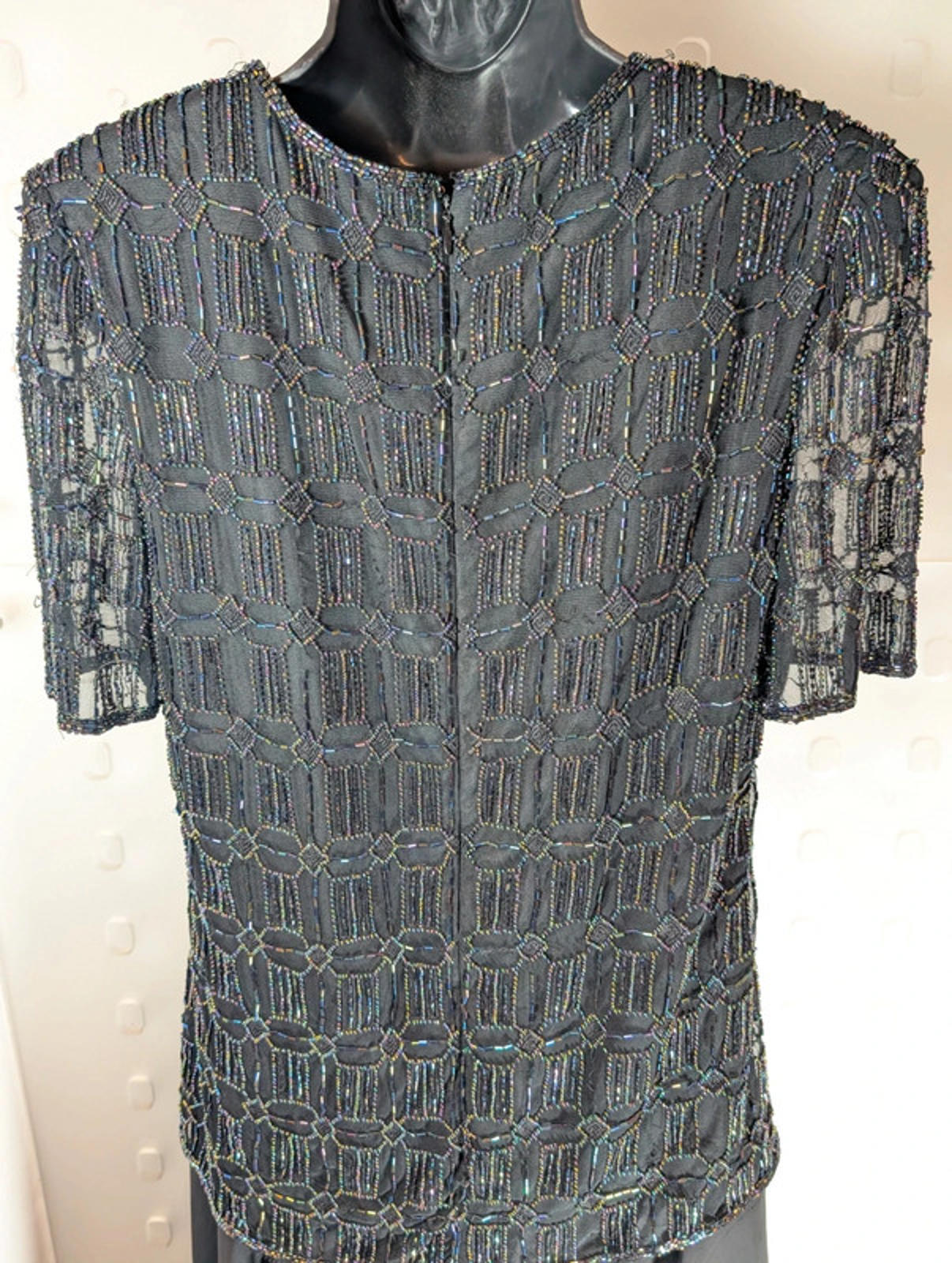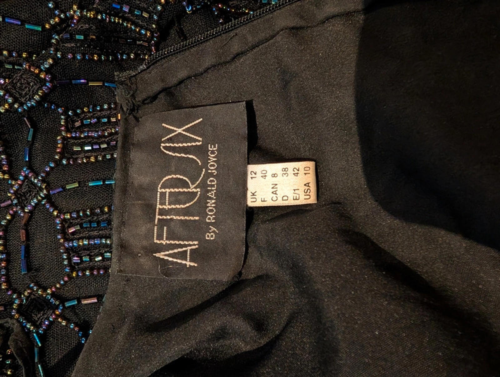 dress in UK 12. Statement black formal dress featuring a heavily hand-beaded bodice with iridescent glass bead detailing and a floaty chiffon skirt. Designed with strong 1980s shoulder pads and a structured silhouette typical of late 80s / early 90s occasionwear. Fully lined and beautifully weighted, showing high-quality craftsmanship throughout.