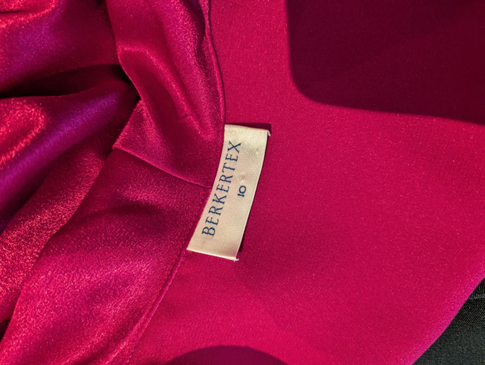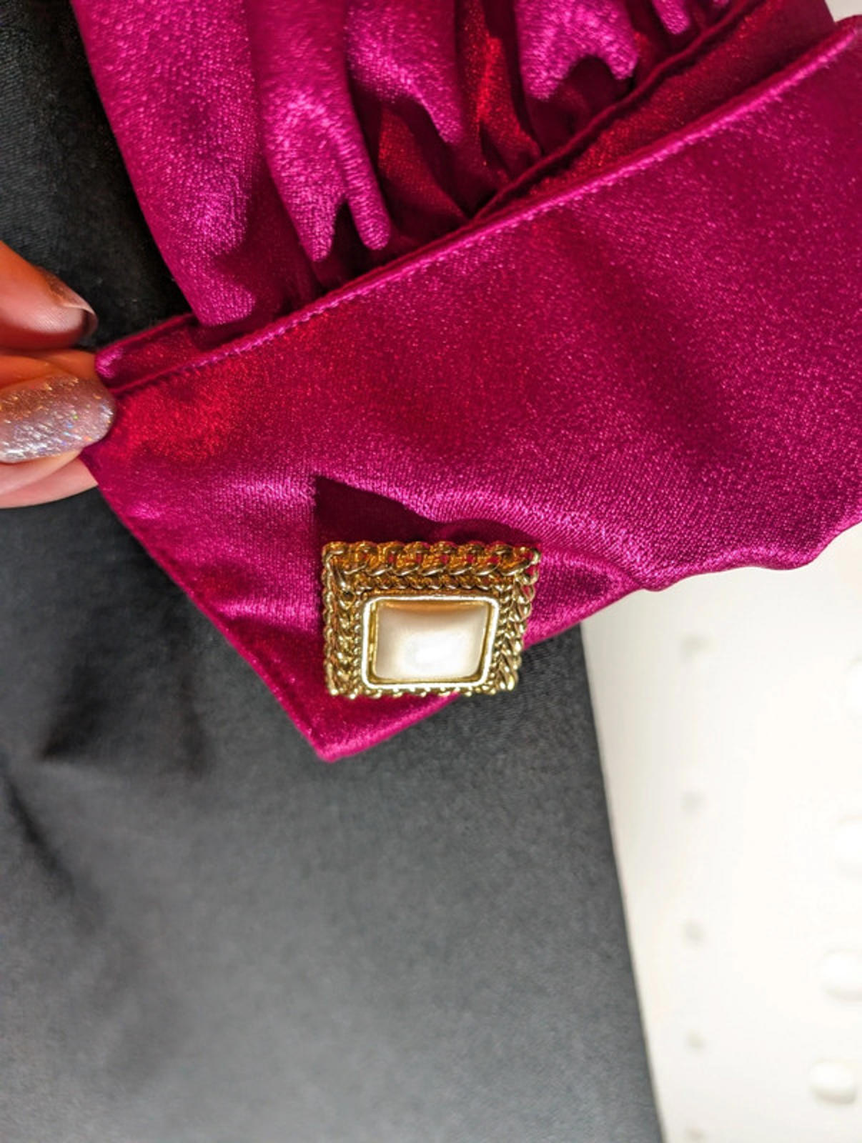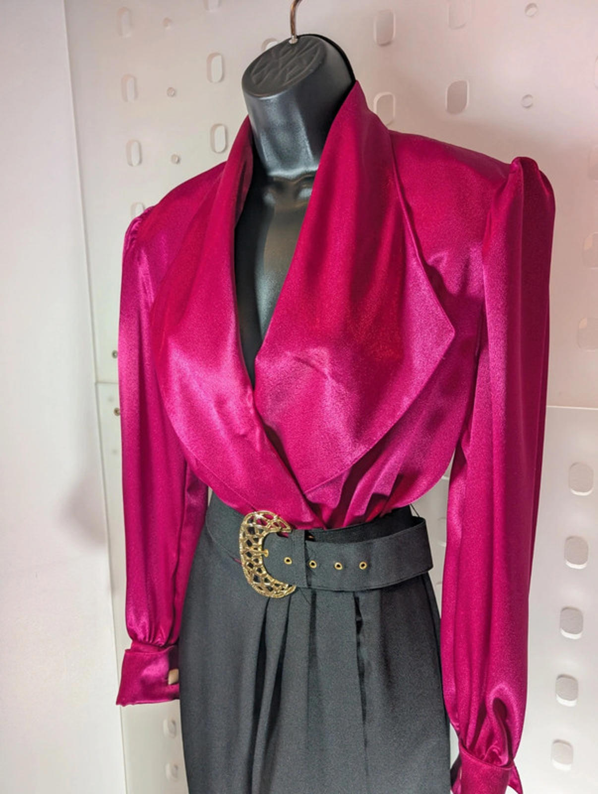 Label UK 10 but best for a modern UK 8. Glossy fuchsia satin top with draped neckline, structured shoulders and gold-trim cuff buttons. Black crepe skirt and the original gold-buckle belt included. Flattering, iconic 80s shape. Excellent condition.