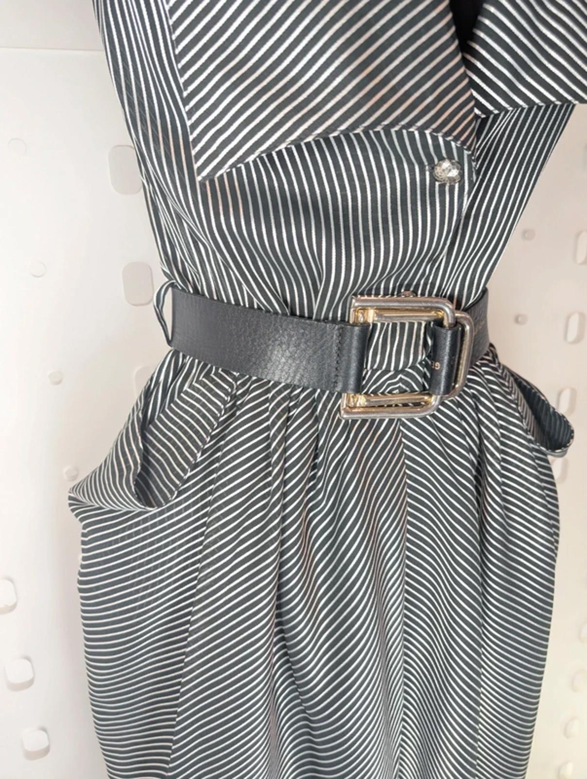 Striking vintage dress in black with fine silver pinstripes. Features a dramatic oversized collar and button front with a flattering fitted waist and softly structured skirt (lined). Strong silhouette that can be worn loose or cinched with a belt for a more defined shape (belt not included).