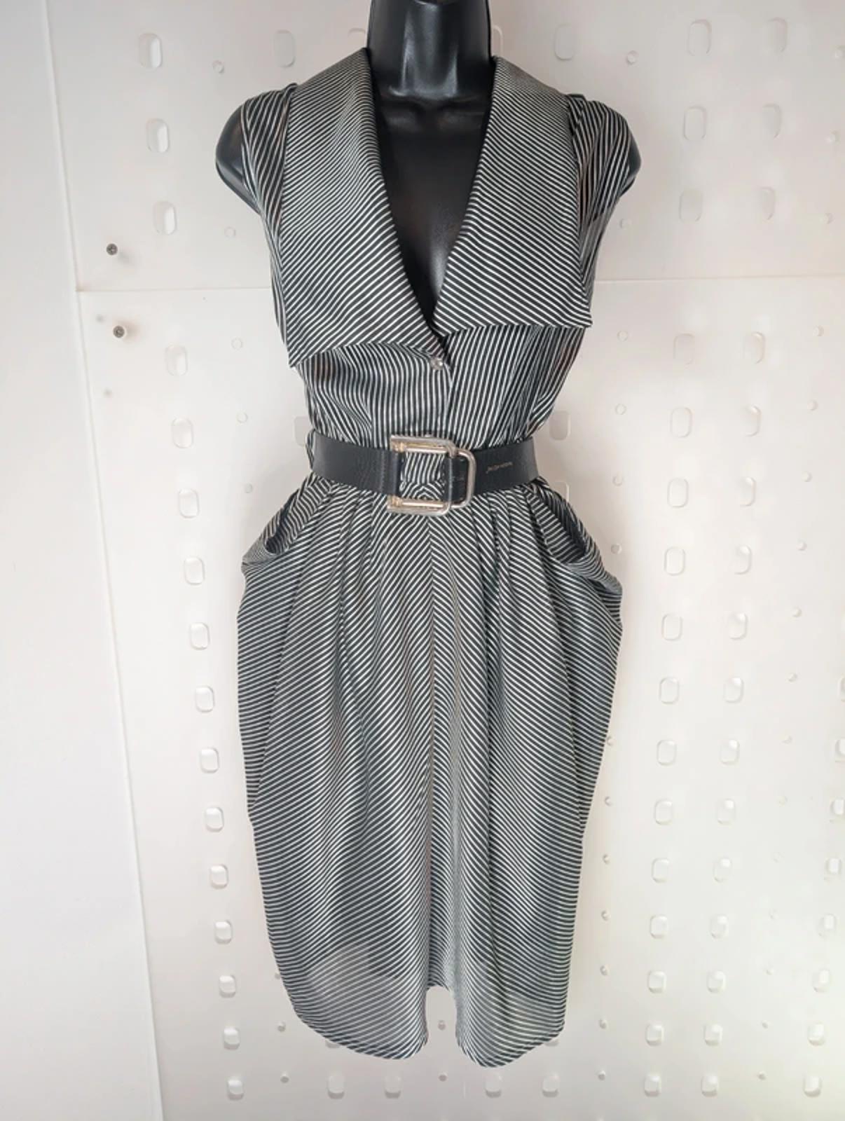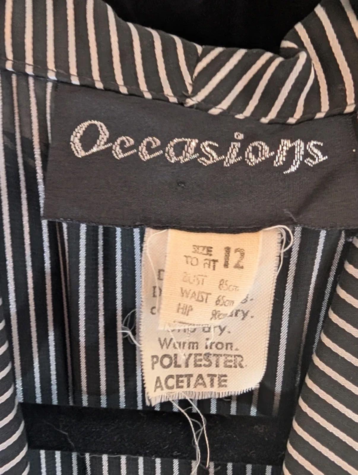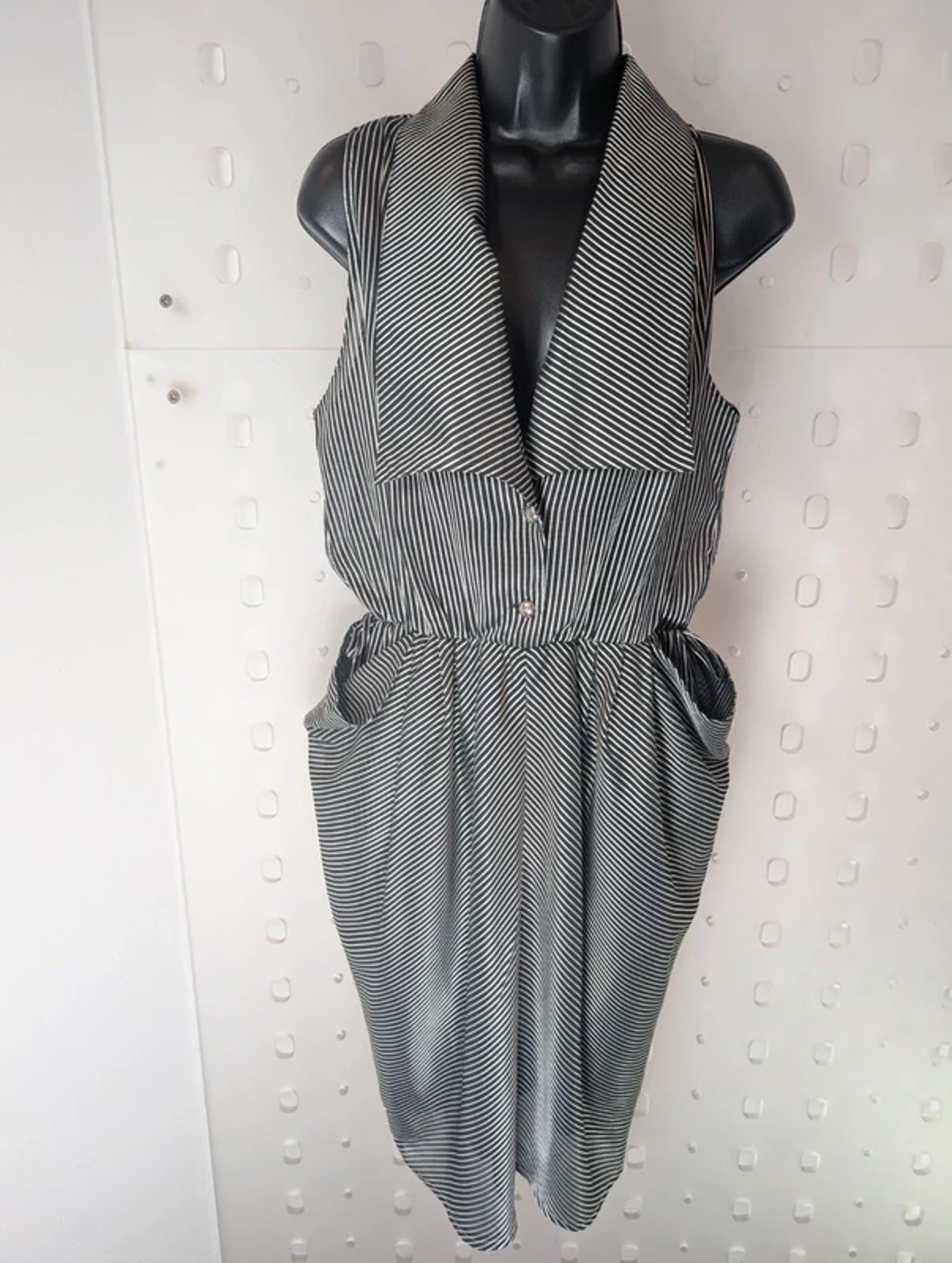 Vintage Black Silver Pinstripe Statement Dress Oversized Collar UK 12