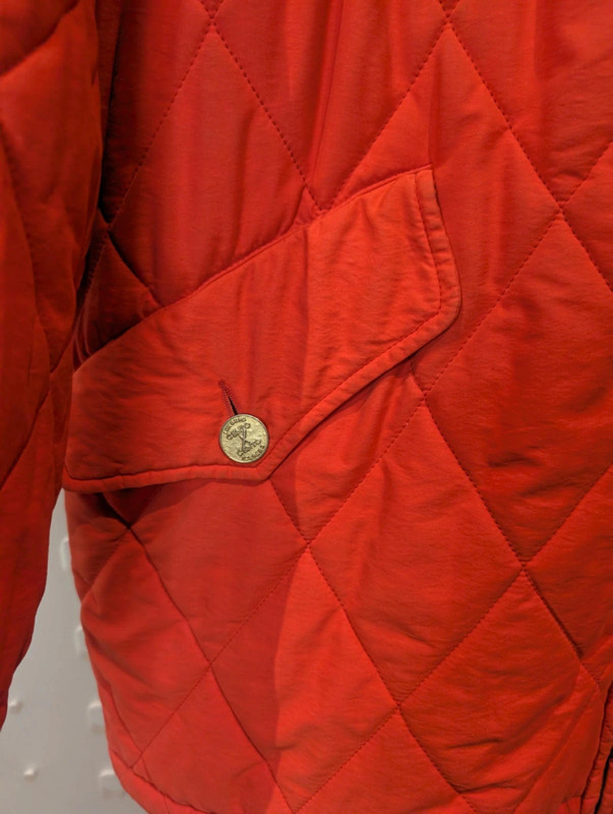 A rare statement piece from Italian fashion house Iceberg’s Cento x Cento line (1991). This oversized quilted coat comes in a bold red-orange tone with diamond stitching, faux fur-trimmed hood, and unique design details that showcase Iceberg’s playful edge:
