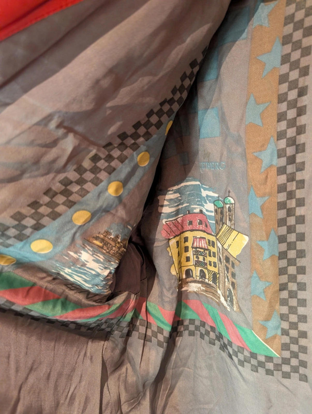 Lining: printed with vibrant architectural and landscape illustrations