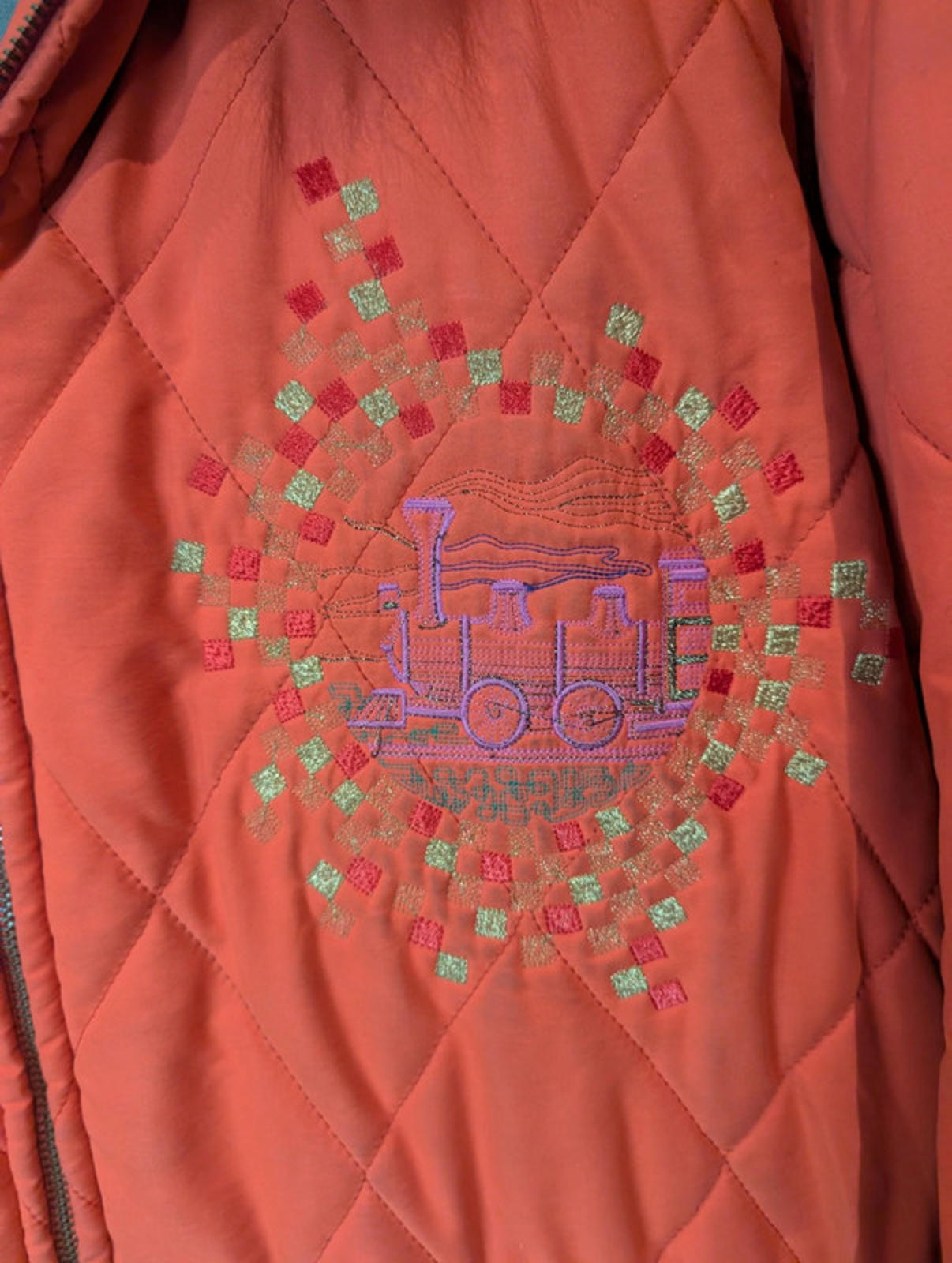 Front embroidery: colourful geometric train motif