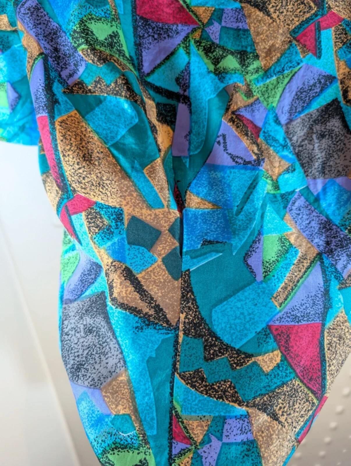 Bold vintage Patra blouse in pure silk with a vibrant geometric print – giving serious 90s Fresh Prince / retro statement vibes. Boxy cut with shaping darts for a flattering fit, plus built-in shoulder pads for that classic silhouette. Finished with delicate covered buttons and spare buttons still attached at the side seam.