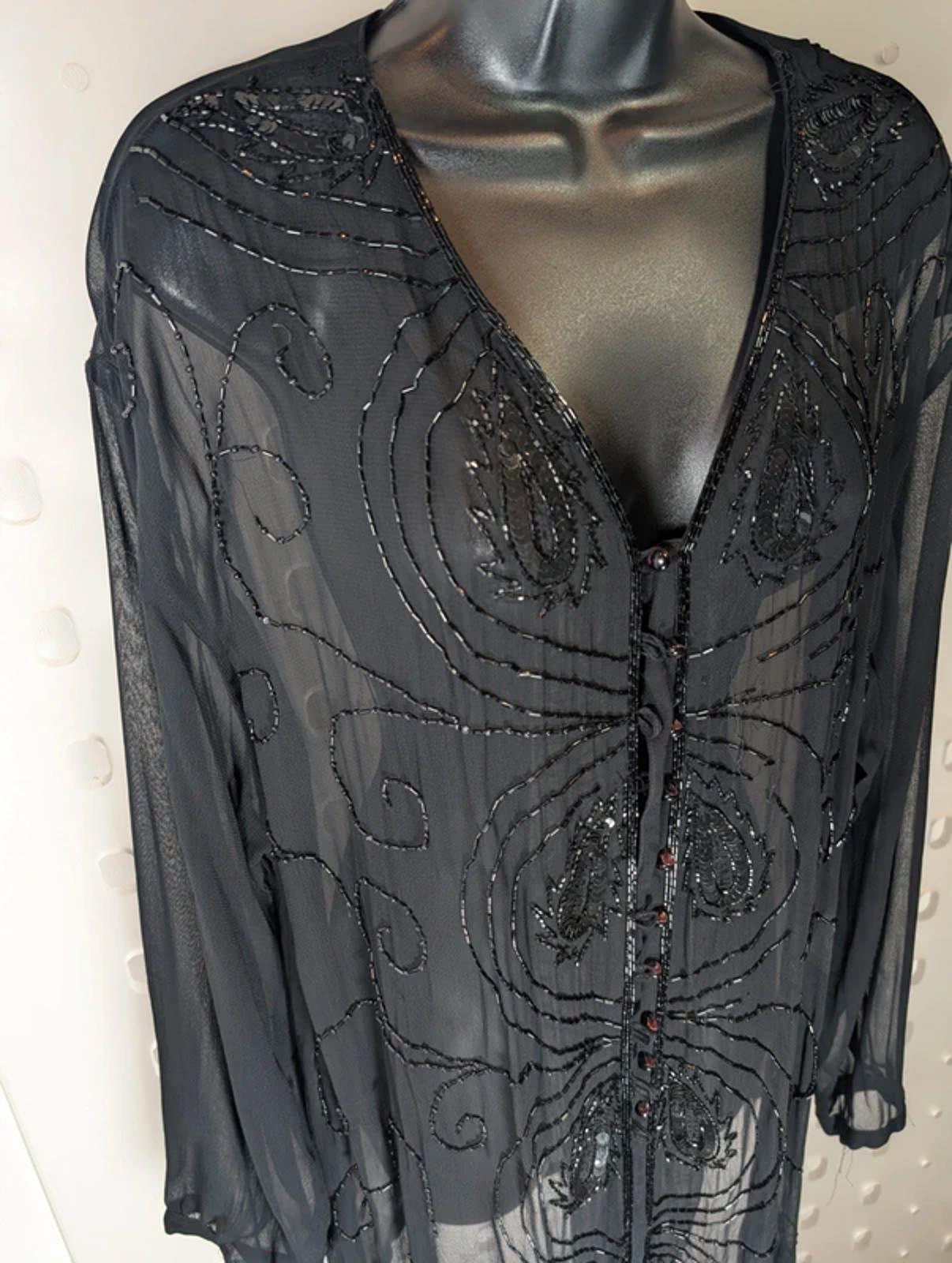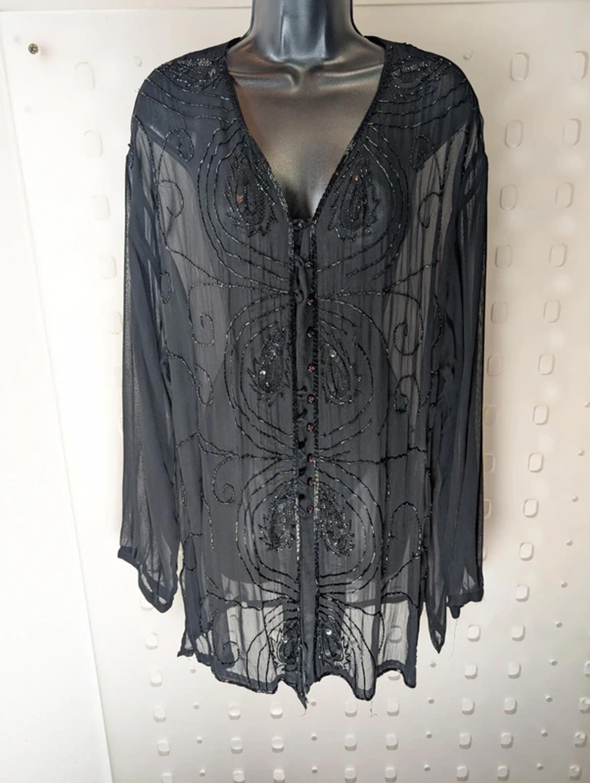 Beautiful vintage sheer blouse with delicate sequin and bead embellishment throughout. Lightweight viscose with a soft drape, designed as an open button-up layer that works perfectly over camis, slip dresses or eveningwear.