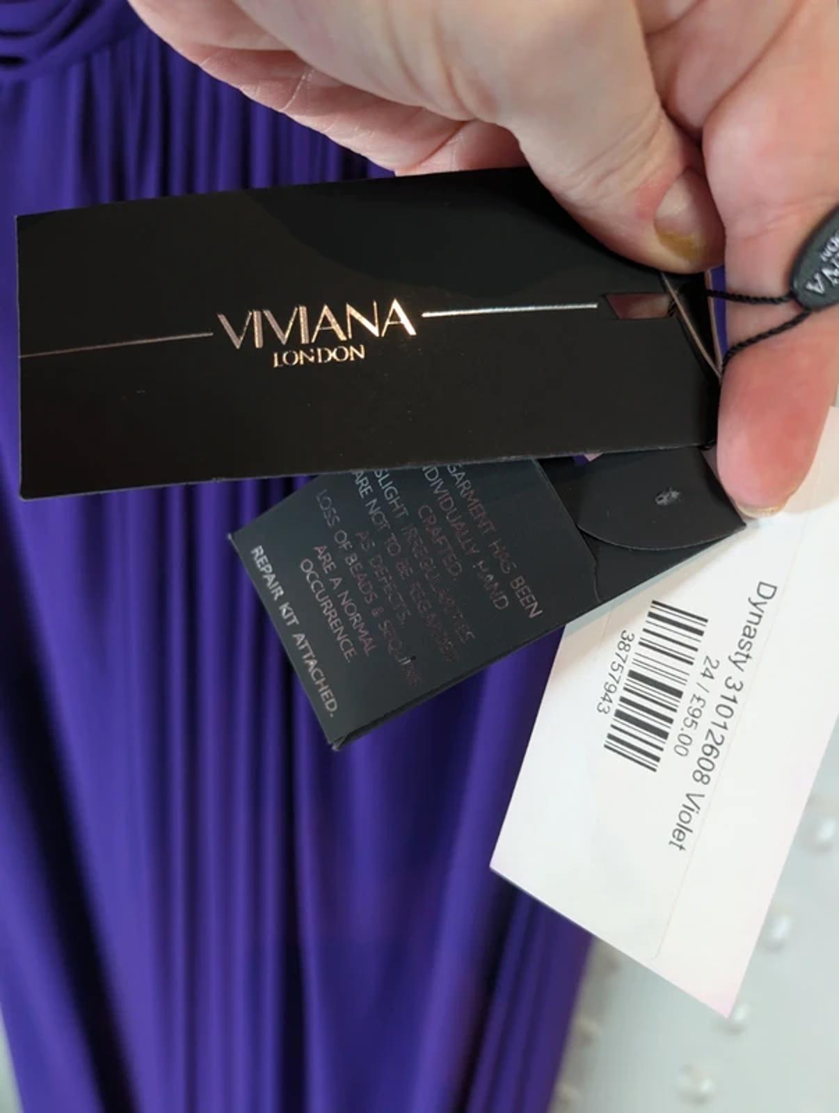 Stunning full-length evening gown by Viviana London in rich violet purple. New with tags (RRP £95). Beautifully embellished bodice with delicate beadwork and flattering ruched waist detail. Fully lined with stretch and internal boning for supportive structure through the bust. Elegant flowing skirt makes this a perfect choice for prom, formal events or black tie occasions.