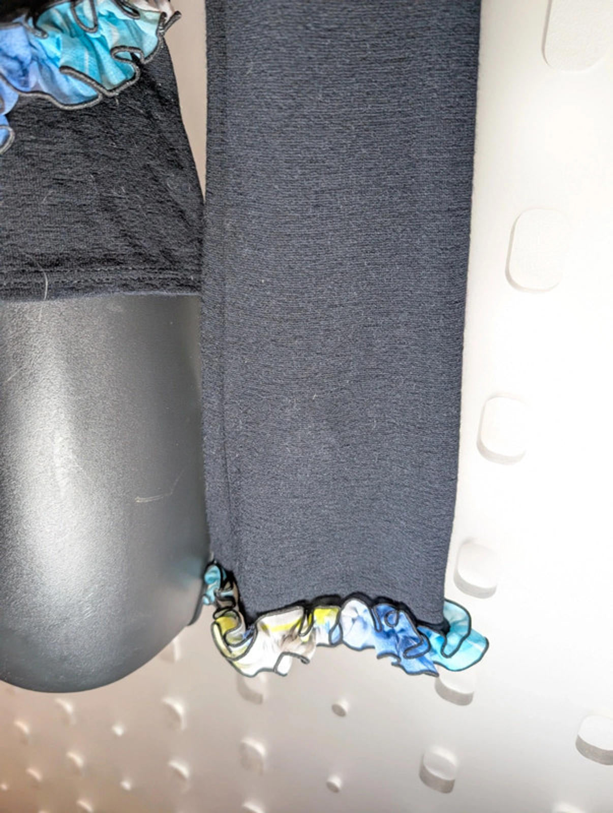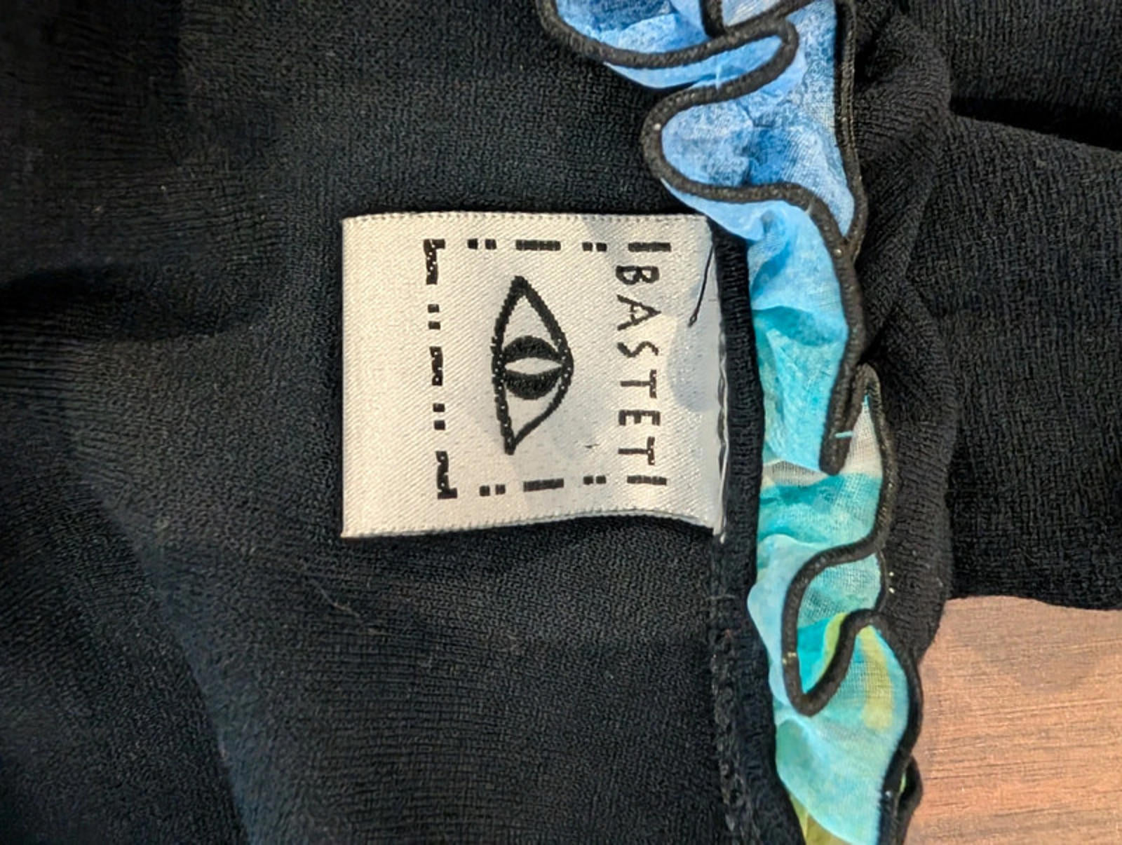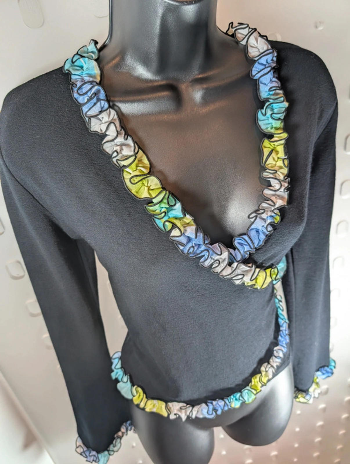 Authentic early-2000s Y2K long sleeve top by Bastet, made from a thick, stretchy jersey that hugs the body beautifully. Features a flattering V-neck wrap-style front with statement ruffle trim in a blue, green and abstract print, repeated at the cuffs and hem for a full Y2K finish.